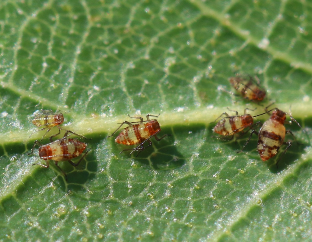 Callipterinella tuberculata aphids are found in colonies on young growth and scattered on older leaves of Silver Birch. The apterae are usually yellowish with a brown head, a reddish-brown dorsal band over the front of the abdomen and a dark quadratic patch on abdominal tergites 4-6. However, the dark markings are very variable. The body length of C. tuberculata apterae is 2.3 to 2.5 mm.