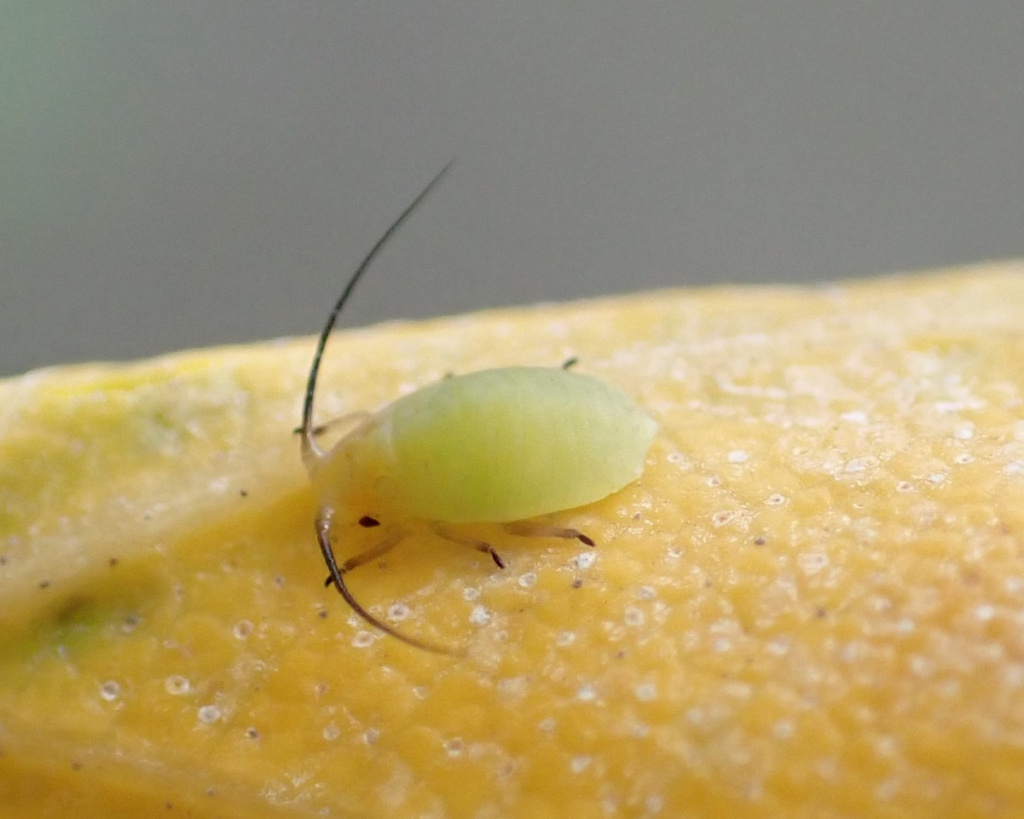 The Solitary Birch Aphid (Monaphis antennata) is associated with Birch. Winged adults and nymphs are green, oviparae are brownish and males are reddish, but all forms have very long and thick antennae that are black except at the base. Unusually for aphids, they are found on upper surface of the leaf, and are solitary or present in very low numbers.