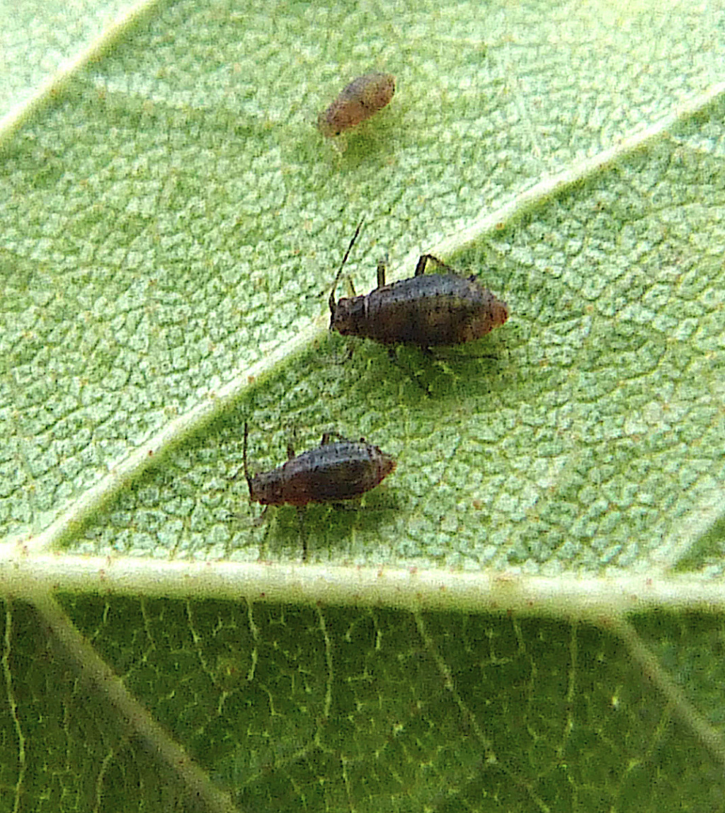 The Small Downy Birch Aphid (Betulaphis quadrituberculata) is usually found on the undersides of Downy Birch leaves, but may also use Silver Birch and very occasionally Grey Alder. Betulaphis quadrituberculata apterae are pale yellowish green but sometimes almost white. In autumn they may have patches of darker pigment. The antennae are shorter than the body. The sexual forms (oviparae) which develop in late autumn are dark brown in colour and rather unusual in shape because the posterior abdominal segment behind the siphunculi appear as an elongate ovipositor-like structure.