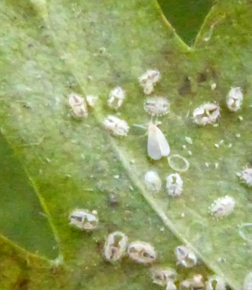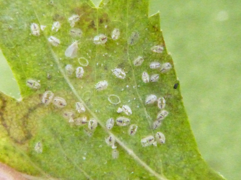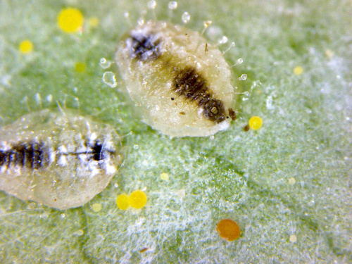 Adults are pale yellowy-white in colour. Puparia are about 1 mm, oval, yellowish white, often medially with an elongated dark spot; dorsally a number of tubular filaments, each with a clear drop of honeydew at its tip and can be found on the undersides of the leaves.
