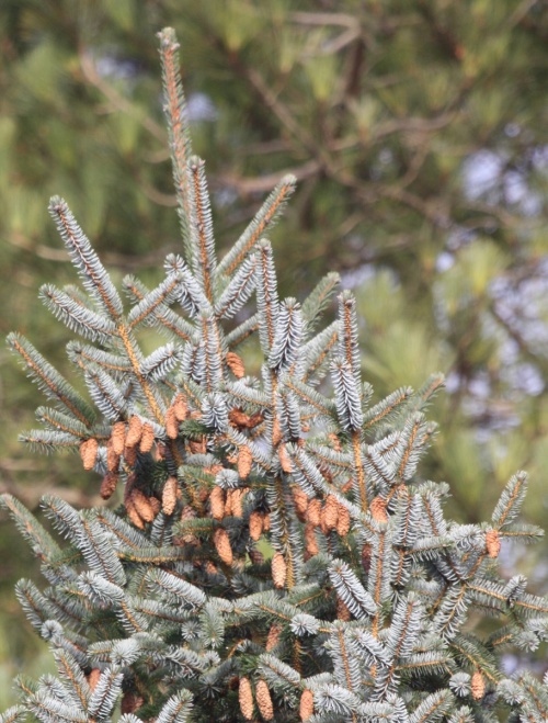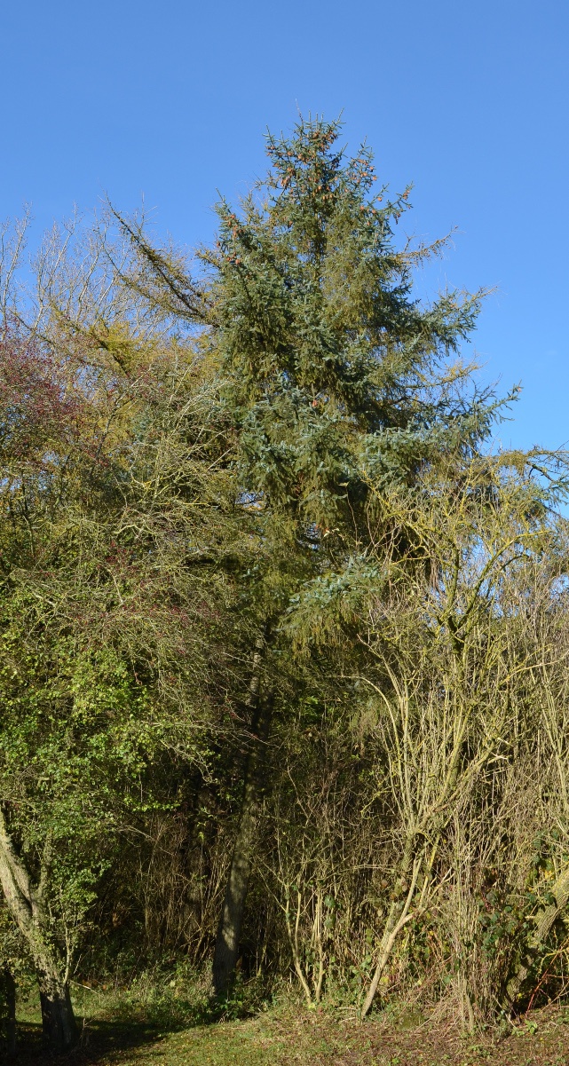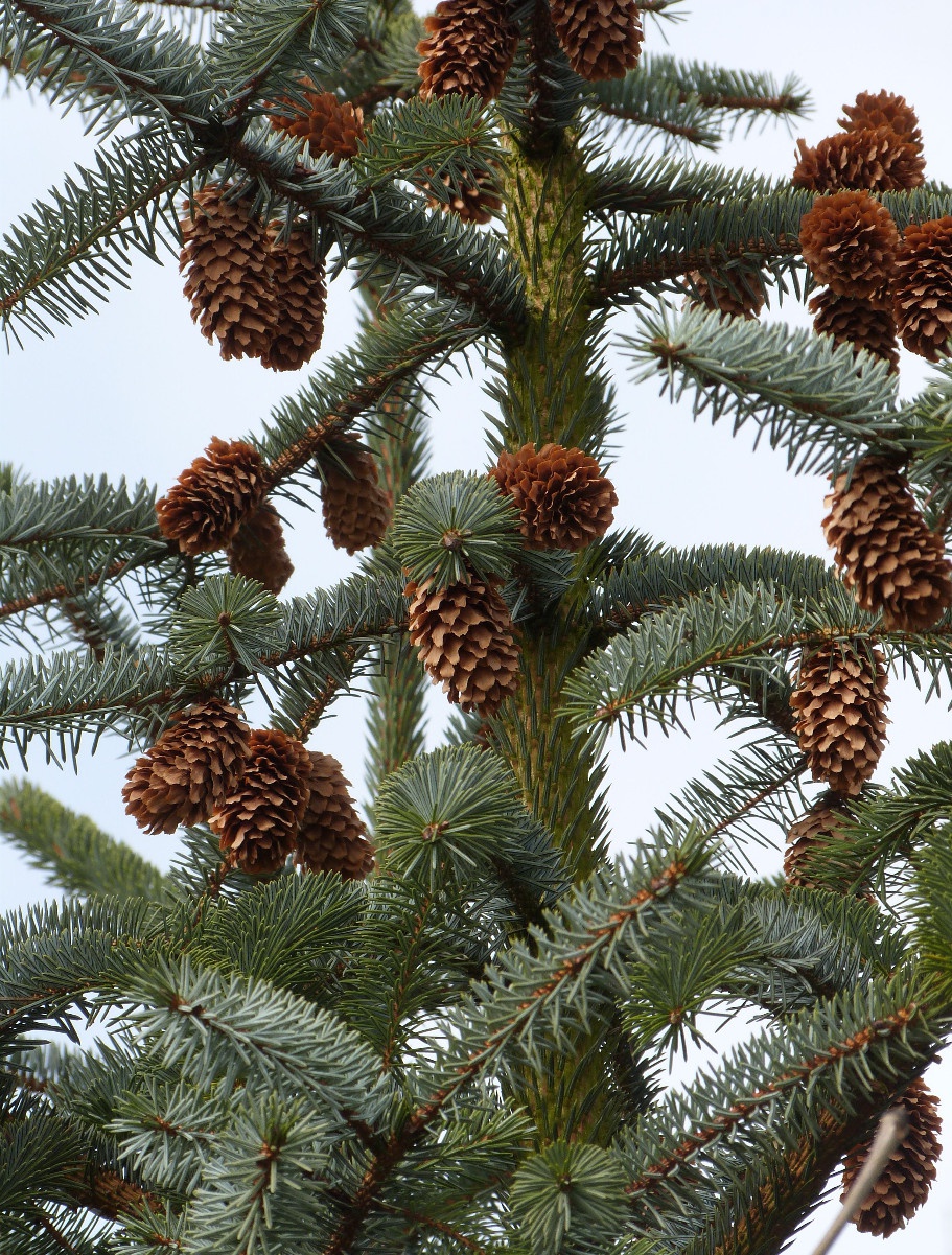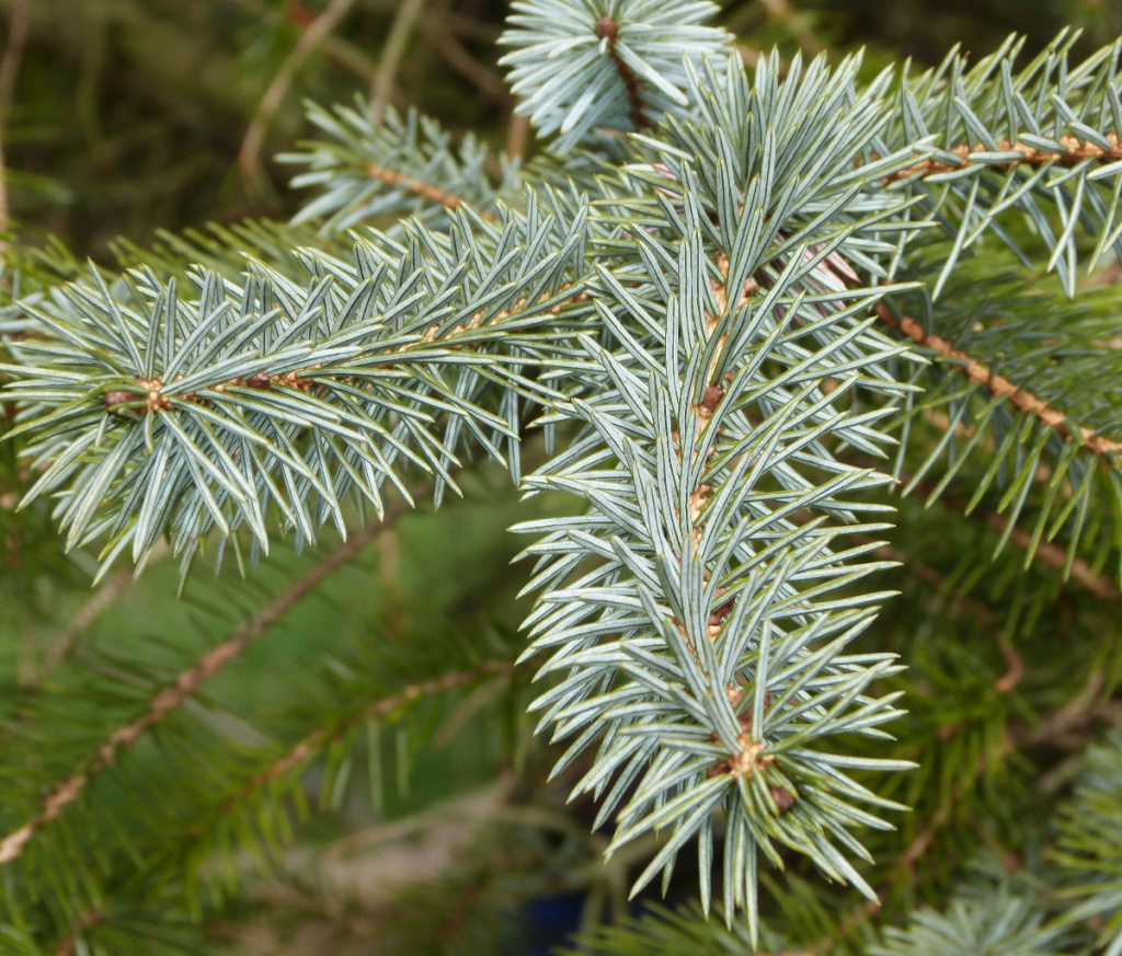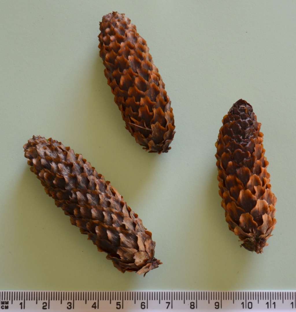 Norway Spruce, and various ornamental Picea that may be planted in parks and gardens. Similar to other Pinaceae species with needles borne singly, but Picea have needles on brown petiole-like pegs