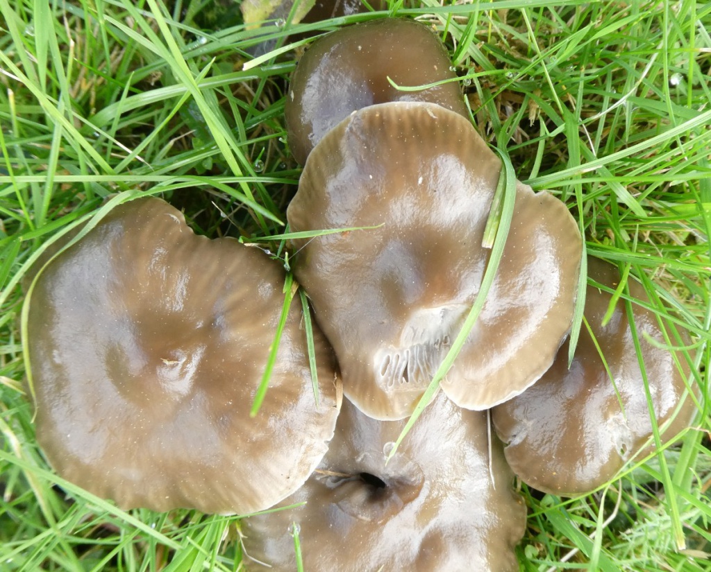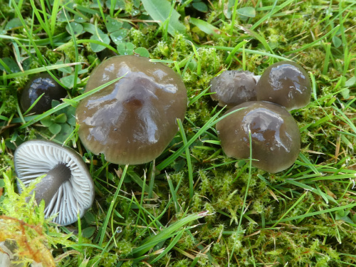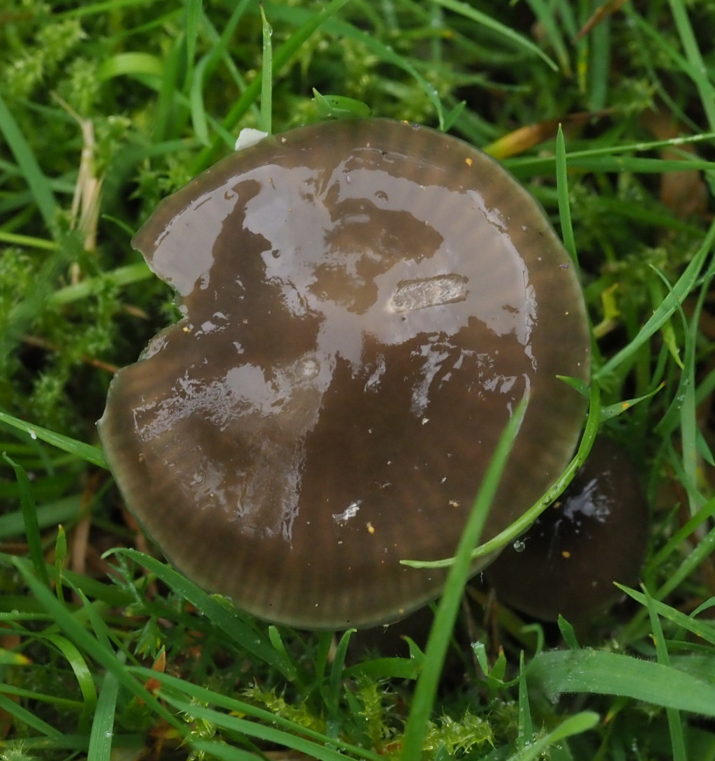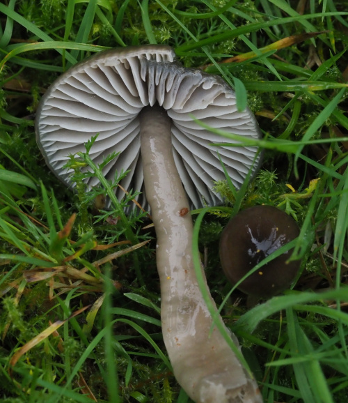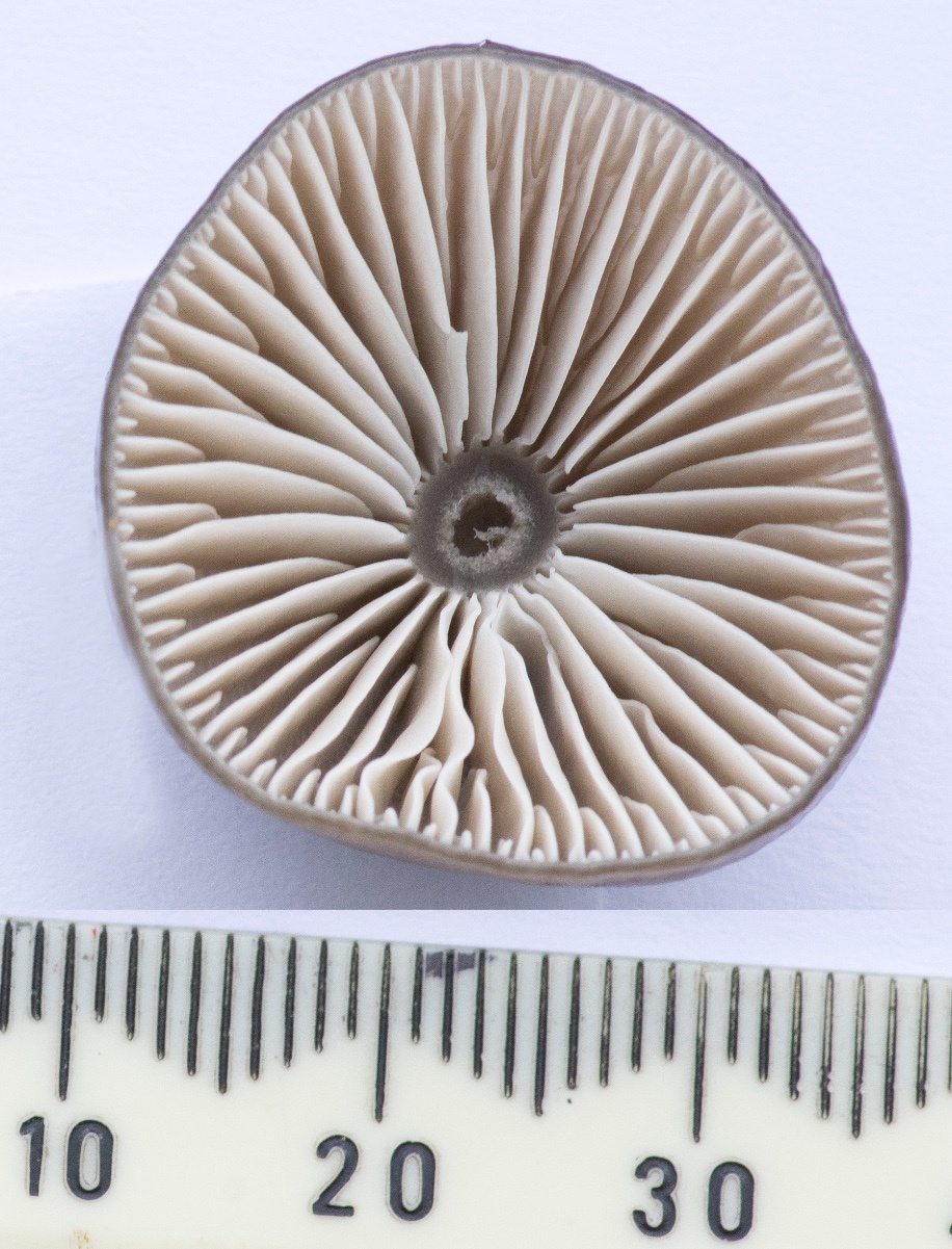 Cap is up to 5 cm across and is smooth, very sticky/viscid, grey brown to grey. The stipe is also sticky. Gills white, thick and wavy. Spore print white, spores ellipsoidal, smooth.