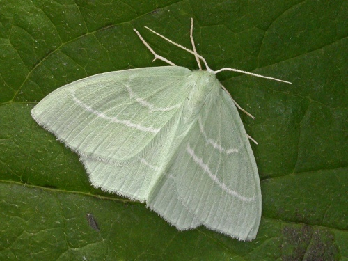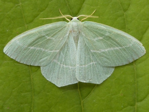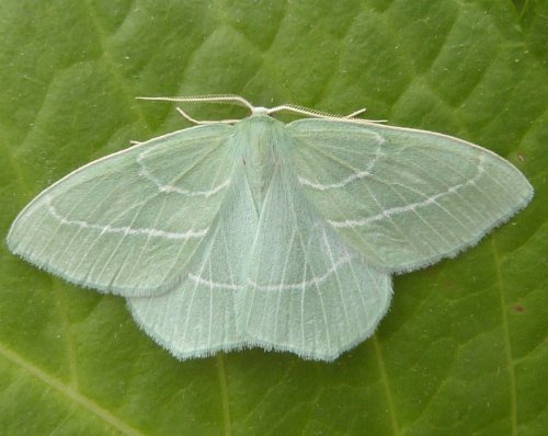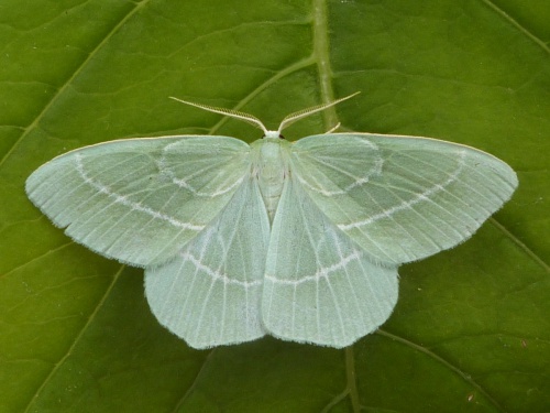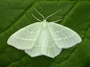 Wingspan 28-32 mm. A distinctive moth. It has emerald green wings that are crossed with white lines. The green wing colour often fades in more mature specimens.