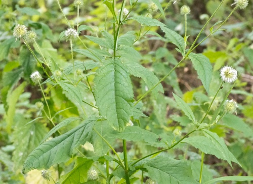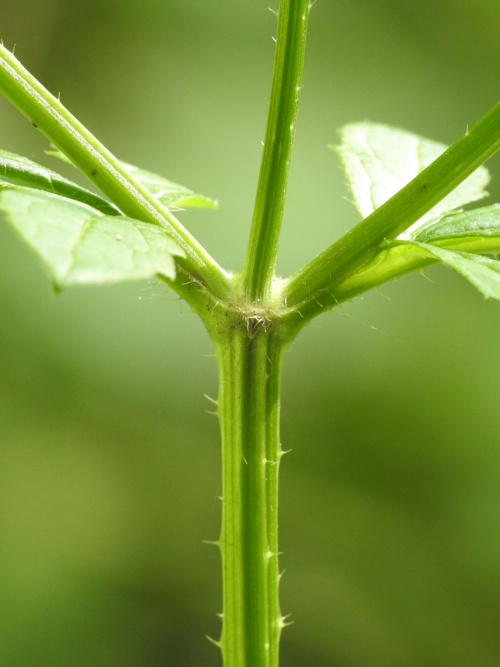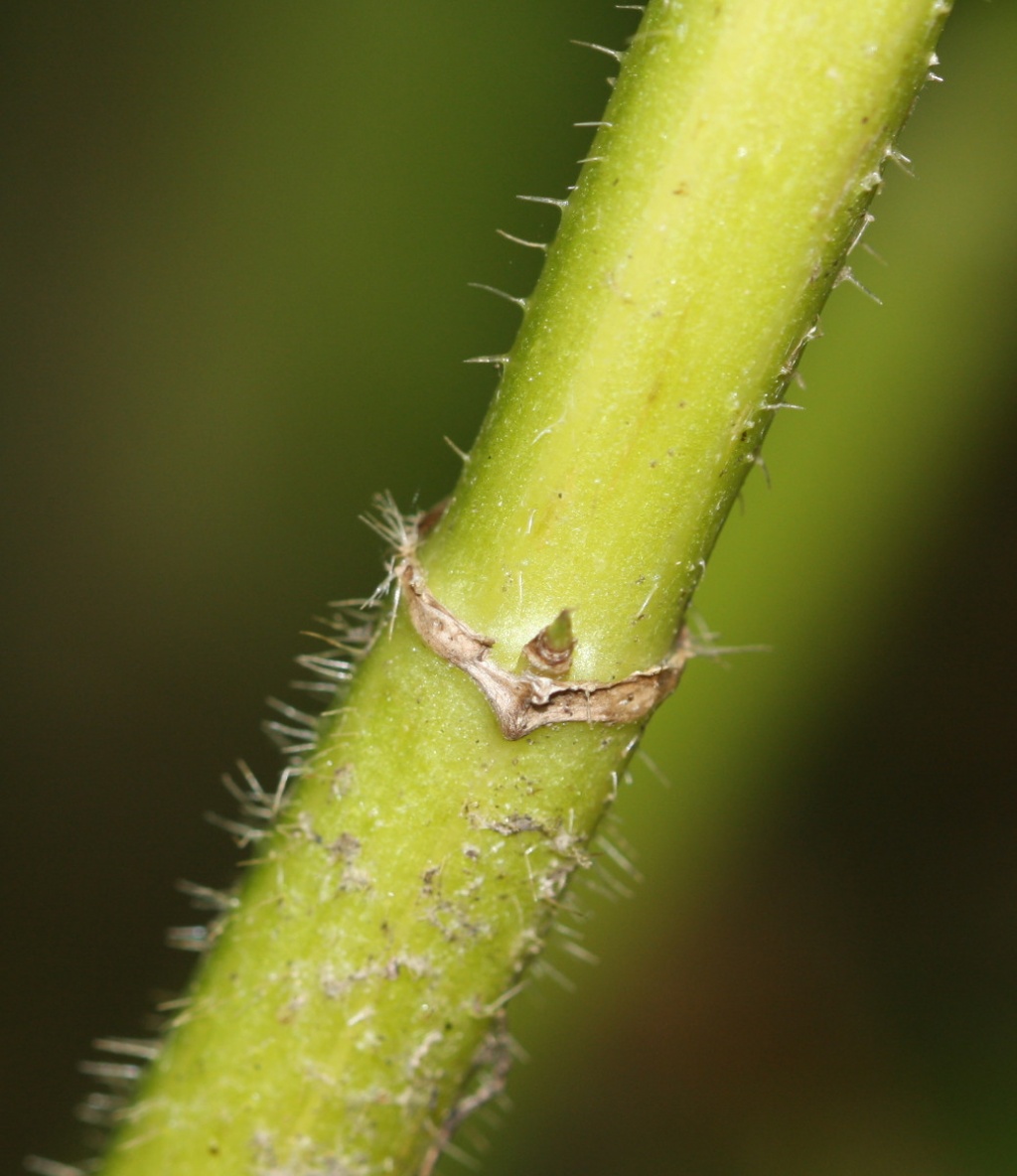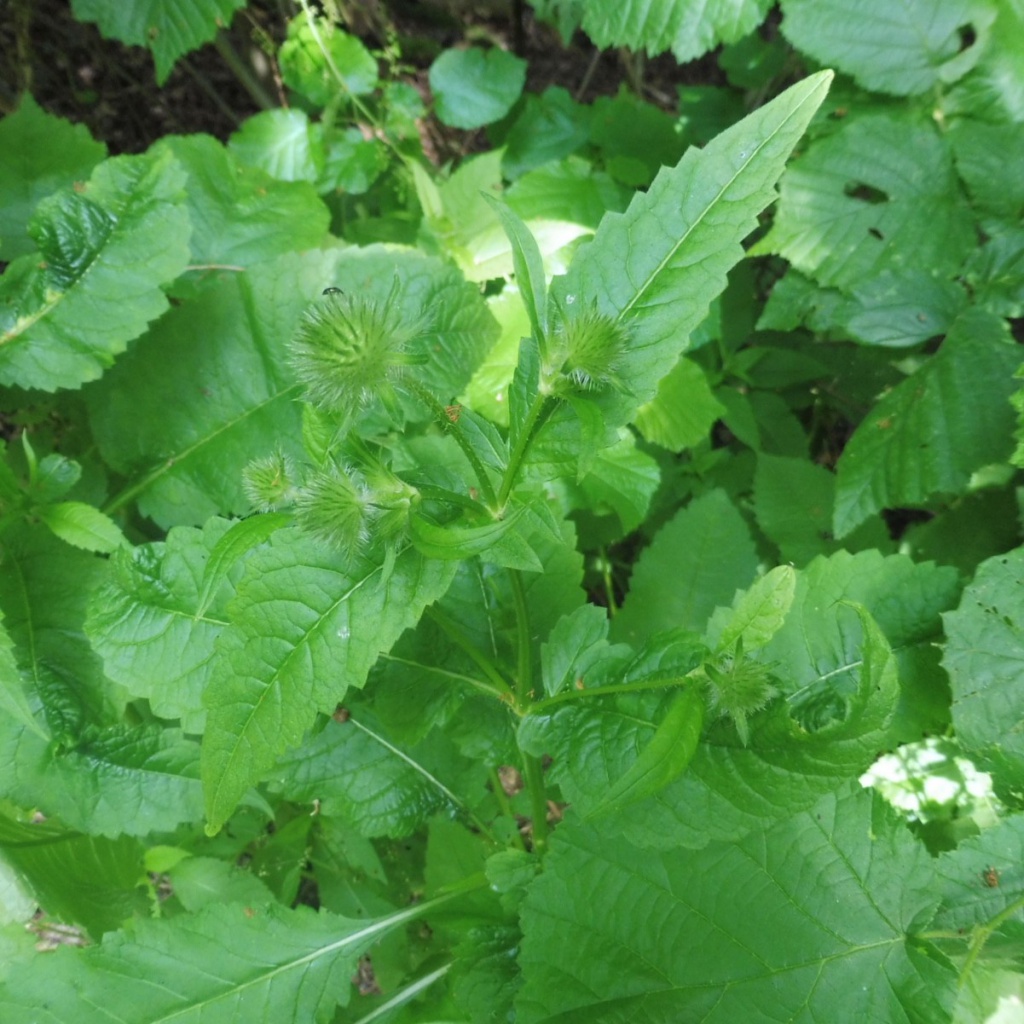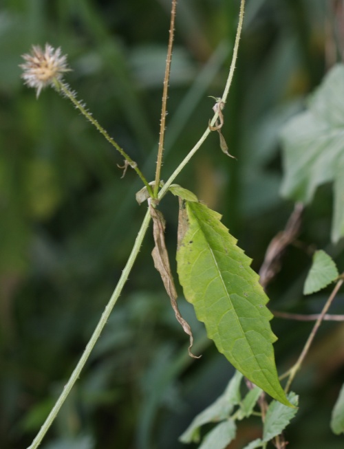 Prickly stems, small round flower heads, upper stem-leaves with stalks