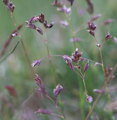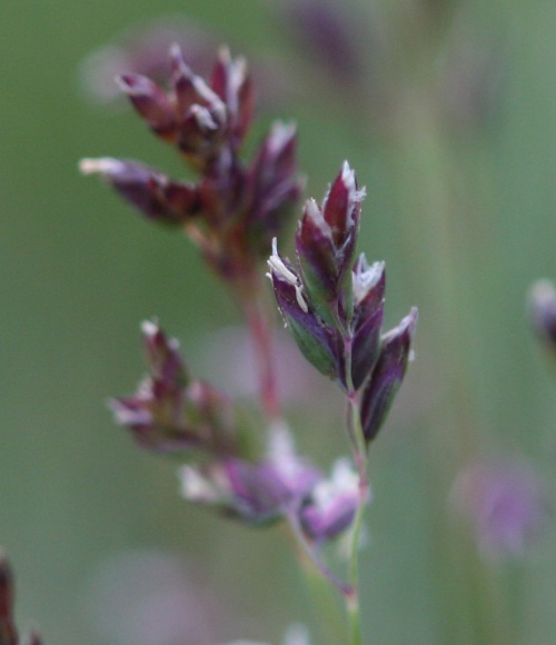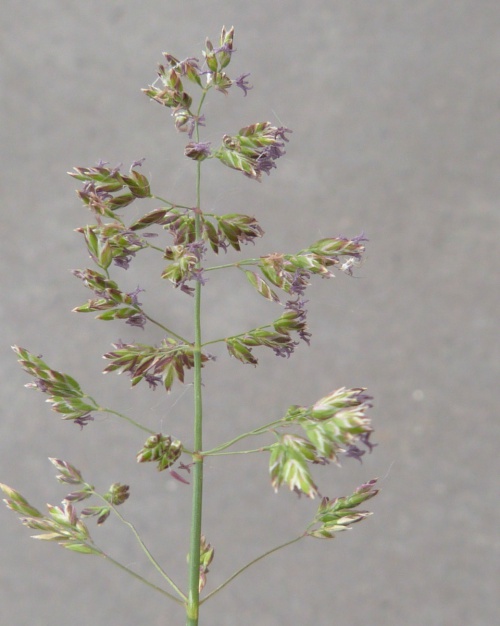 The panicle is clearly branched, with three or more branches at the lowest whorl. Spikelets contain two or more florets without awns. Lemmas easily seen extending beyond glume tips. The ligule is shorter than wide and the lowest sheath is smooth when gently rubbed in either direction against the lips.