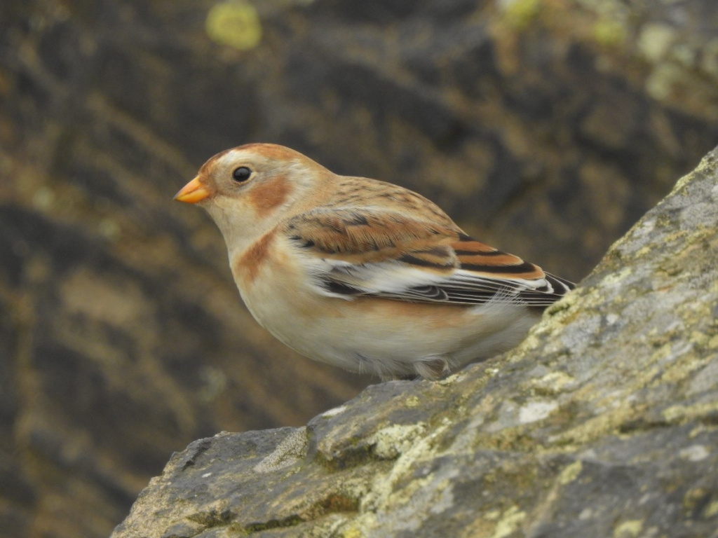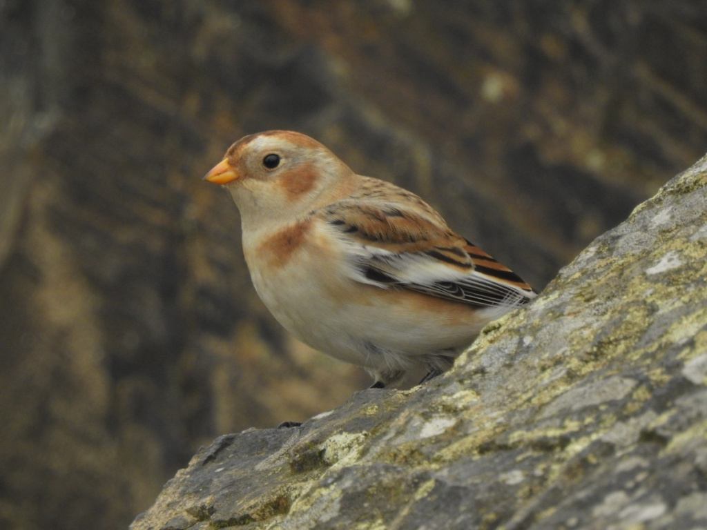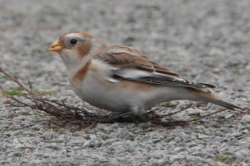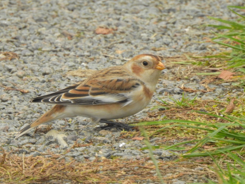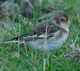 Snow Buntings are large buntings, with striking `snowy' plumages. Males in summer have all white heads and underparts contrasting with a black mantle and wing tips. Females are a more mottled above. In autumn and winter birds develop a sandy/buff wash to their plumage and males have more mottled upperparts.