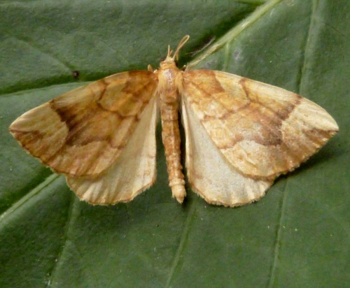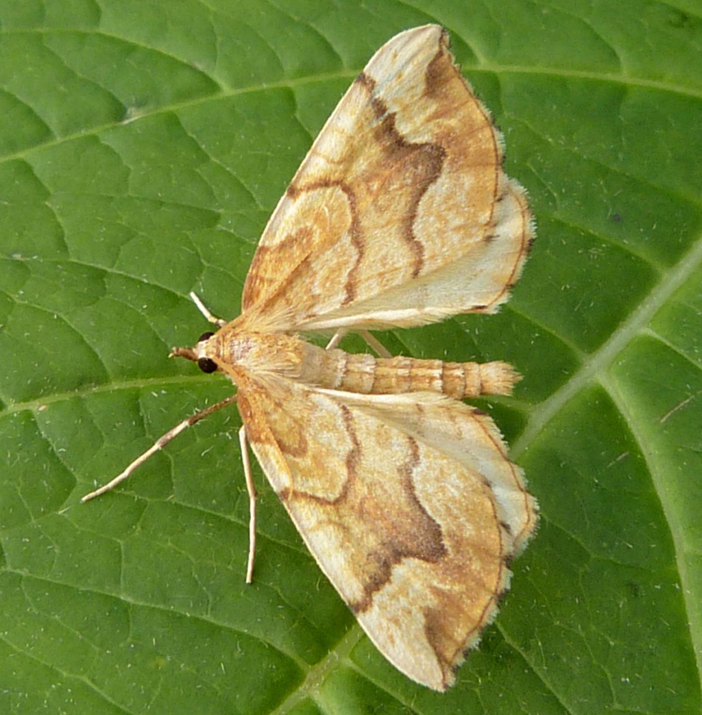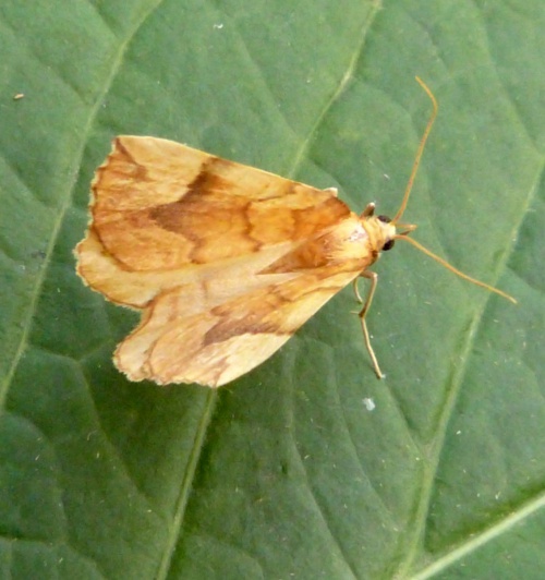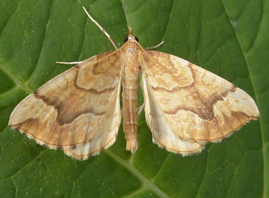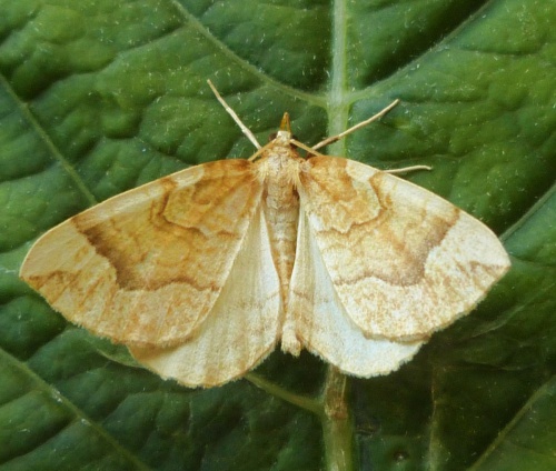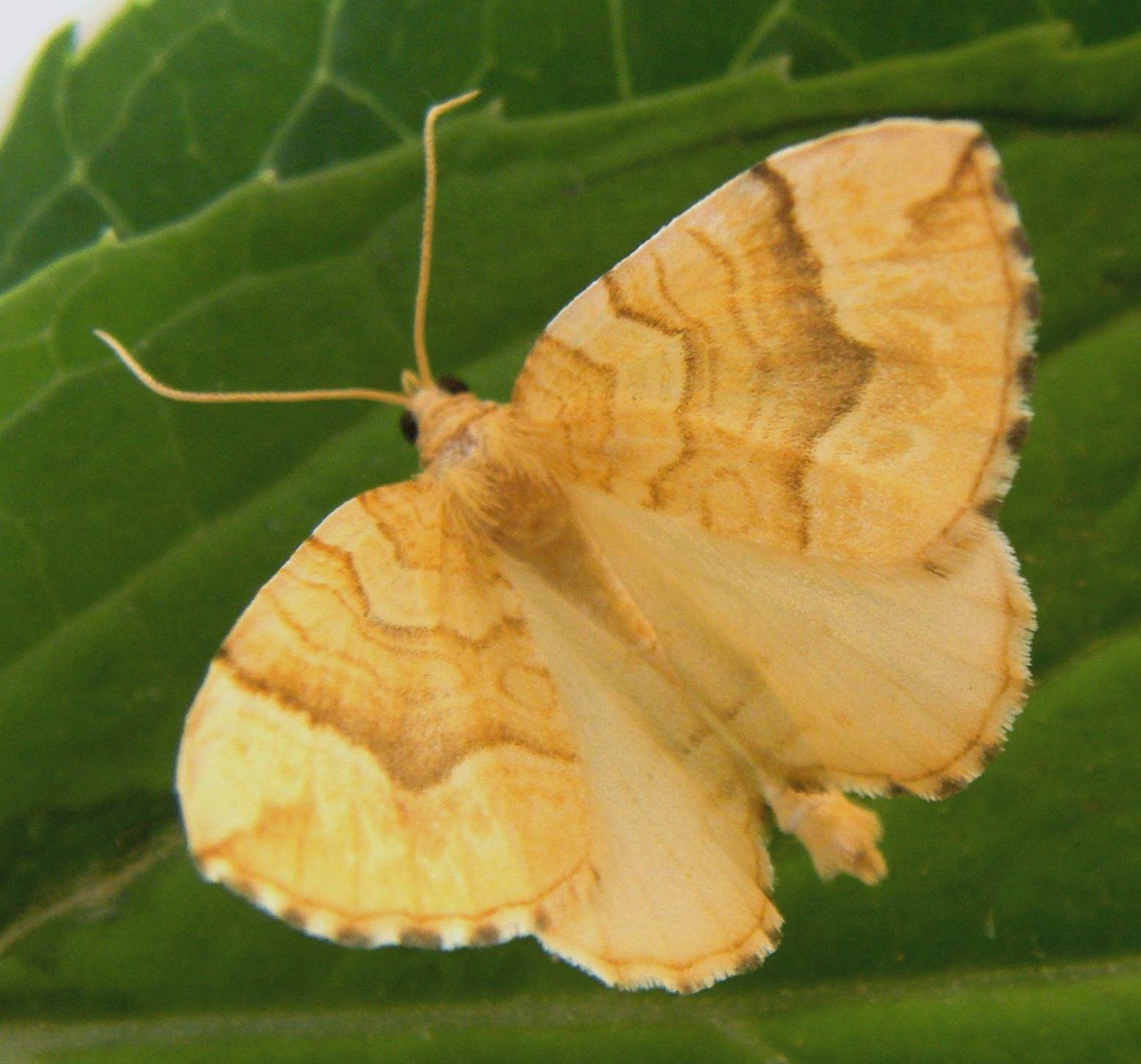 Wingspan 27-30 mm. The straw yellow wing bears a darker central band with one large tooth like projection on the outer edge. The wing fringes are chequered.