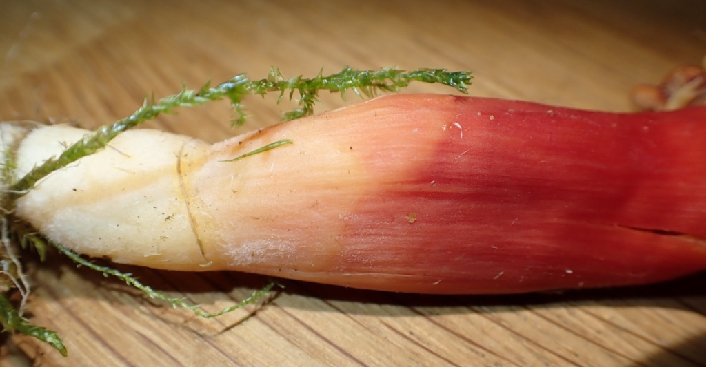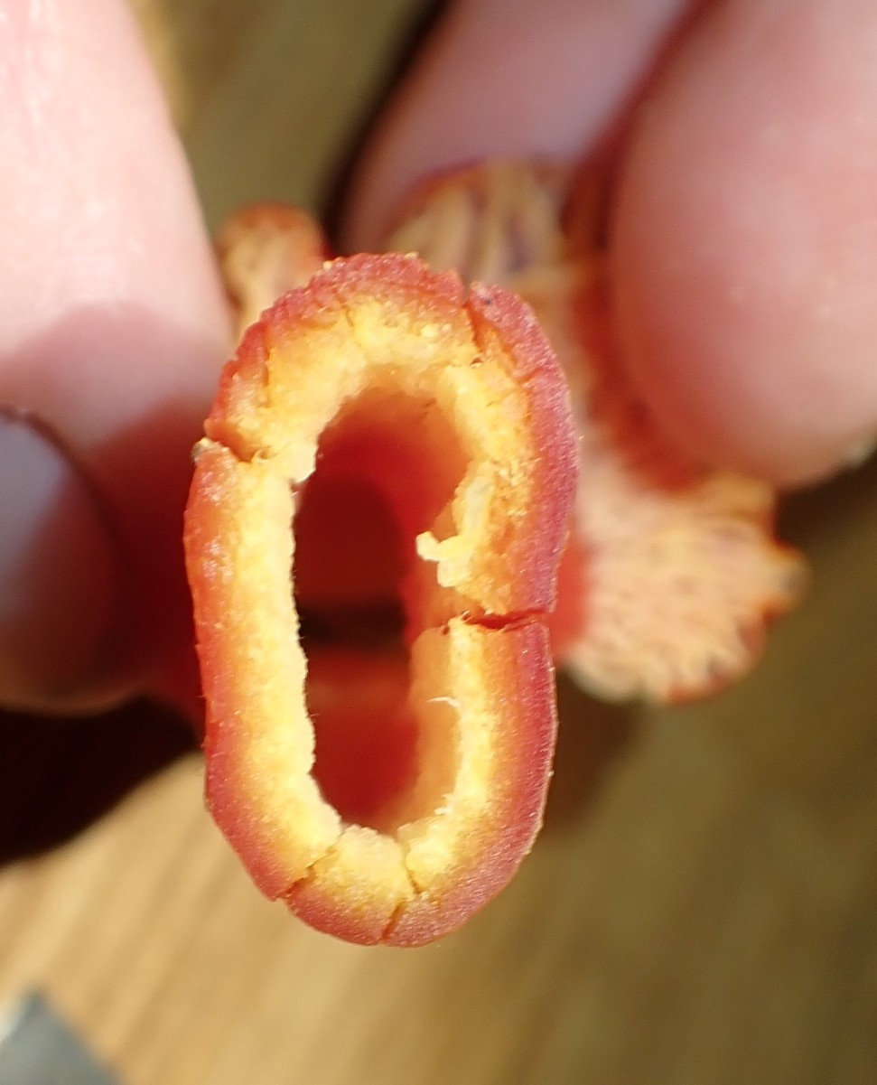 A large waxcap, with cap 5 to10cm across; initially conical, becoming shallowly convex or flattening, usually with a broad umbo; bright deep scarlet; smooth; dry or only very slightly greasy. Stipe is smooth red wirth yellow fibrils and a yellowish base, and is flattened or twisted particularly near to the base. In cross-section the stipe is seen to be a compressed oval, unlike the very similar Hygrocybe punicea which has a stipe with rounded cross-section. There is a pleasant smell of honey as the fruitbodies dry out (to detect this, place a section of the cap in a closed container for a whole, and sniff immediately when you open it.)