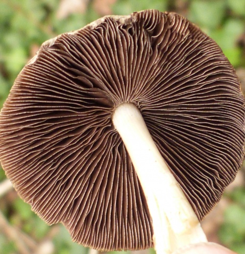 Dark reddish-brown cap, becoming yellowish-brown. White flecks of veil at edge. Gills greyish-brown to darker brown.