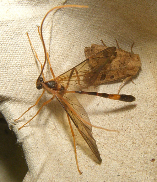A striking, large ichneumon with exceptionally long, orange antennae and orange legs. The abdomen is black and orange.