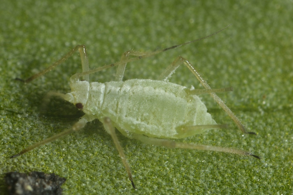 The Hellebore Aphid (Macrosiphum hellebori) is a sap feeding aphid which infests the flowers and foliage of hellebores. It is largely pale green and around 3 mm long with black bands above the 'knees' and dark 'feet'.