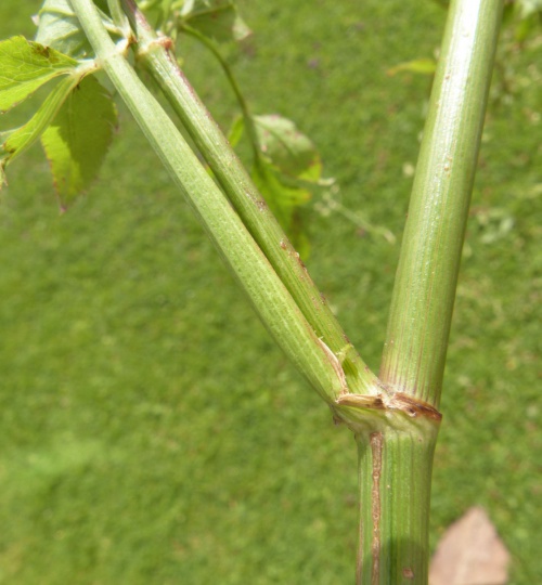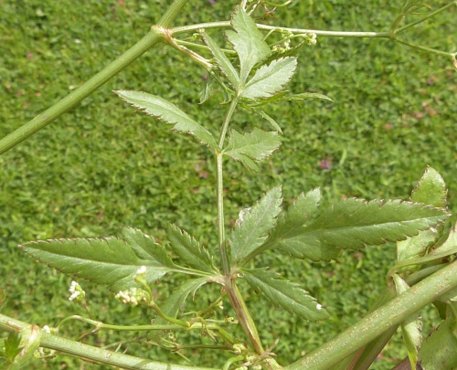 An erect hairless plant with a nauseating smell when crushed. Stems solid, finely ridged. Leaves pinnate, with 5 to 9 pairs of oblong, toothed leaflets, often lobed. Flowers white, small (1 to 2 mm), in umbels with 3 to 6 uneven rays. Bracts linear, short. Fruit almost globose.
