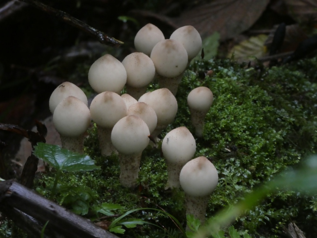A small long-stemmed puffball, often pear-shaped, typically found on tree stumps or buried rotten wood, often in troops or clusters. Young specimens are covered in small short, conical spines that fall off as it matures. It is whitish at first, darkening as it ages, and eventually has a smooth papery brown skin with little patterning. The stem has solid flesh, and it is attached to the substrate by white root-like mycelial cords. As it matures, a darker zone can be seen developing at the apex; this eventually becomes the pore through which the spores are released.