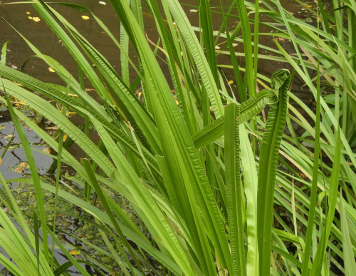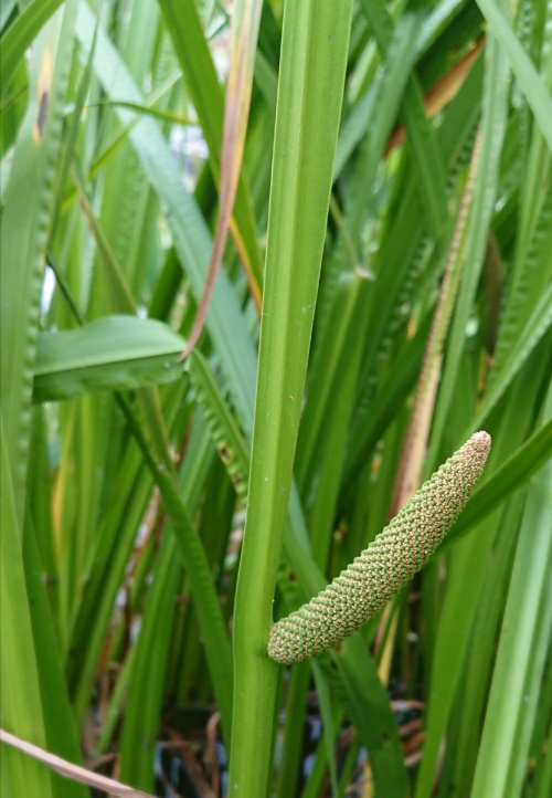 Medium to tall, tufted, rhizomatous plant. Leaves linear, pointed, rather Iris like. 7 to 20 mm wide, often with one or both margins crinkled, smelling sweetly when bruised. Flowers tiny, greenish yellow in a compact, narrow ascending cone 5 to 9 cm long, the stem prolonged above the flower cone into a leaf like spathe.