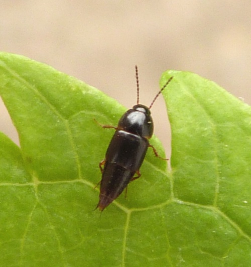 This is a relatively common dark coloured rove beetle and it has the typical short wing cases.