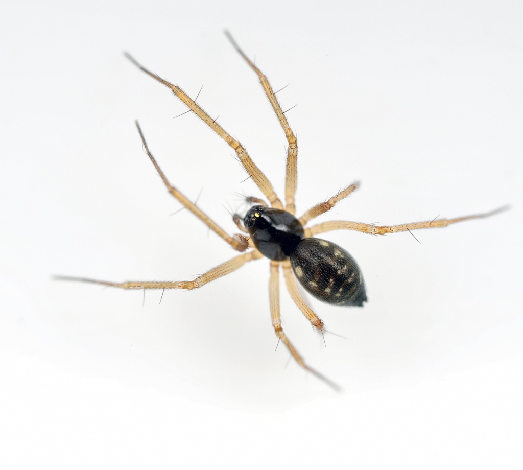 A small, black bodied spider with pale yellowy-brown legs.