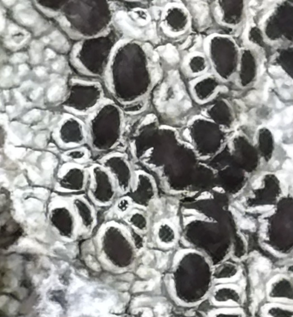 The pale grey thallus is thick and areolate with a blackish prothallus. Apothecia (1-2.5mm) are black, both round and irregular, often immersed into the thallus with flat discs and margins that are often swollen.