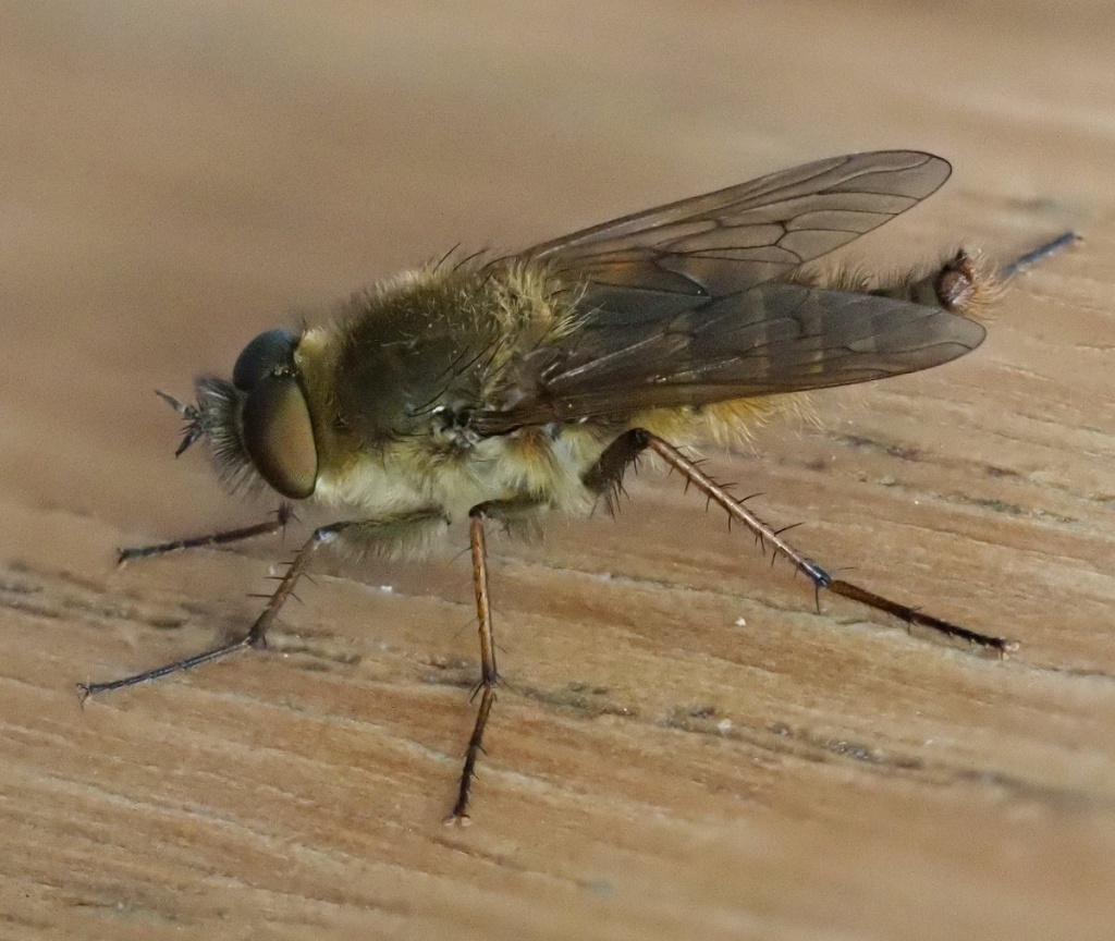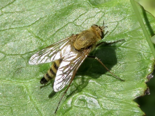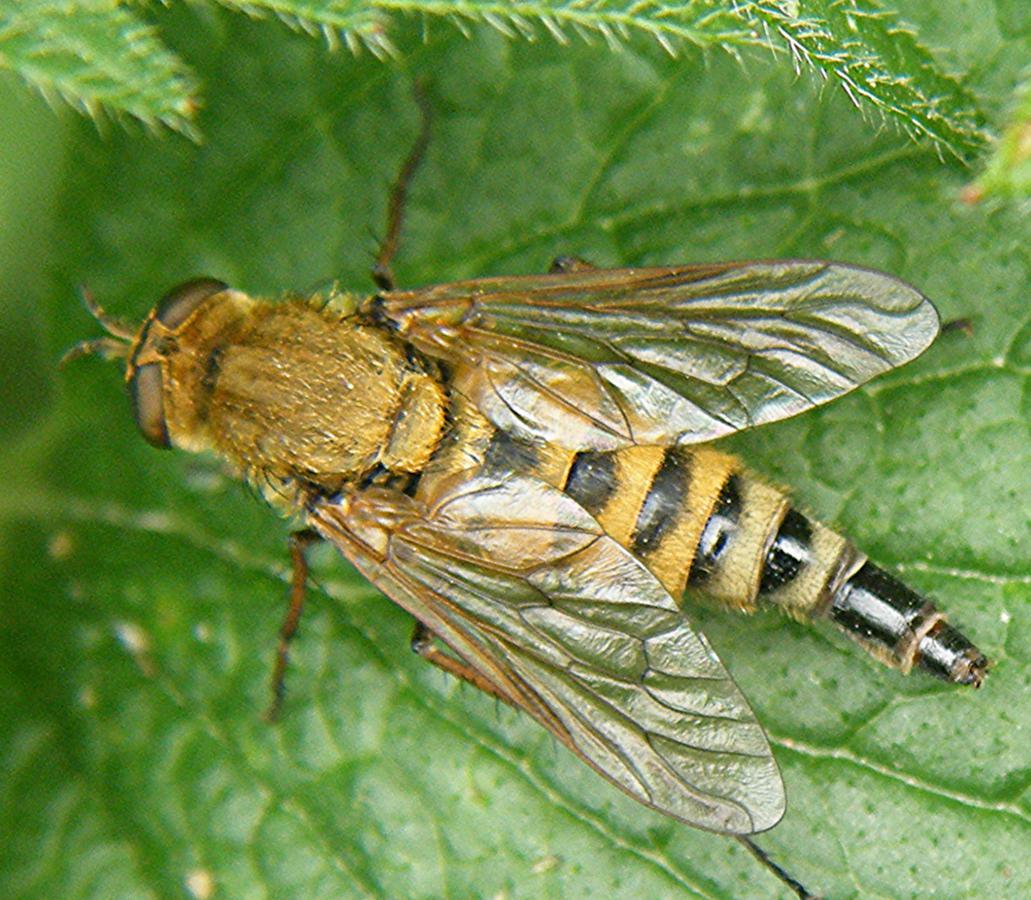 This fly has a long hairy body with slender legs. The adults are conspicuous with their golden hairs and banded abdomen. The female abdomen in quite pointed.