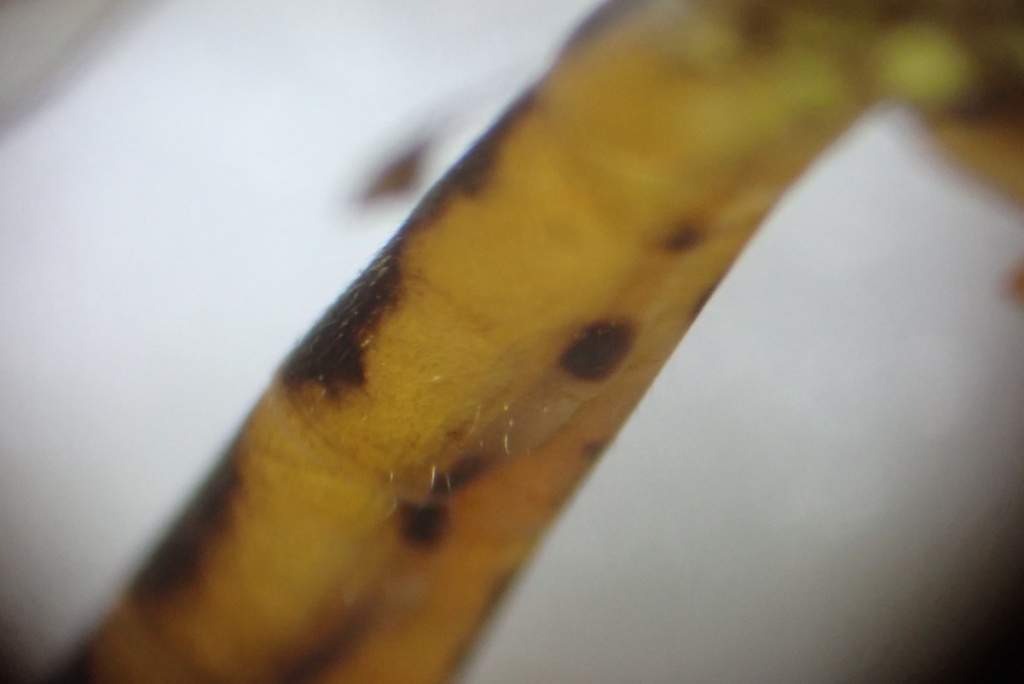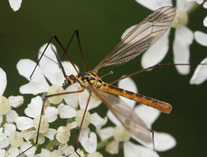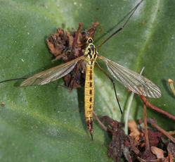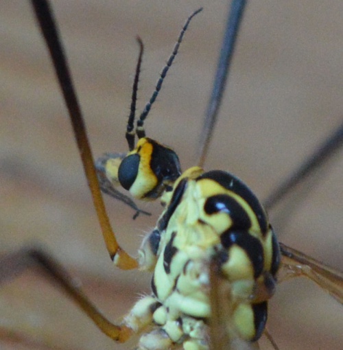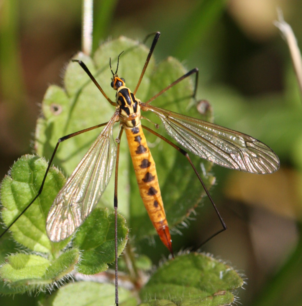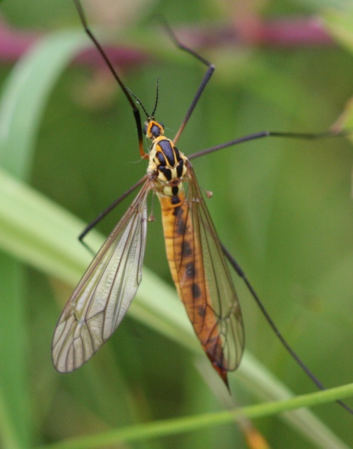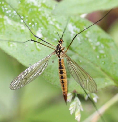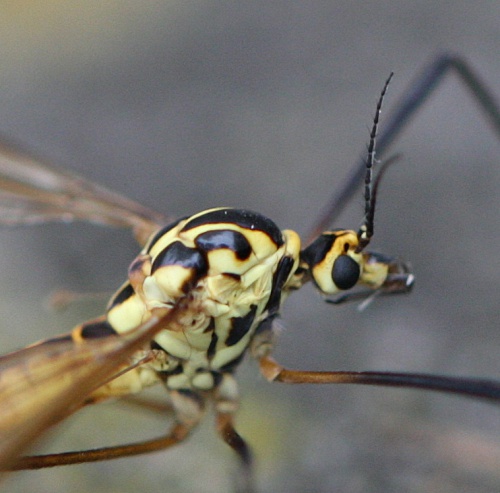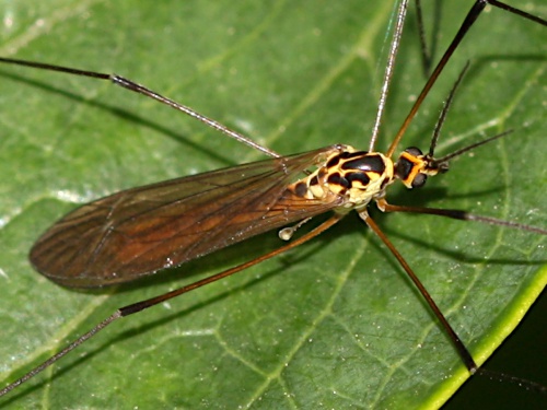 Length about 18 mm. This cranefly has a yellow and black thorax and yellow abdomen with a thin and normally broken black stripe down the centre. It also has a black 'ace of spades' mark on the back of its head.