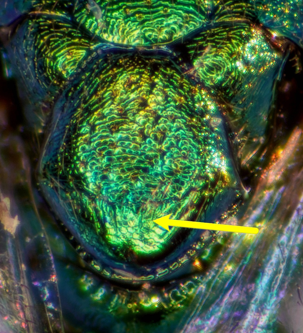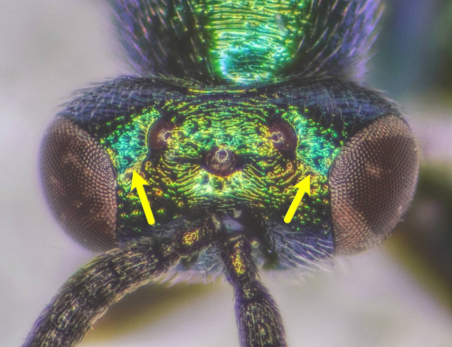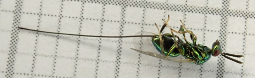 Length 2-3.5mm, ovipositor sheaths longer than the body. Dorsal surface of hind coxa with at least a few setae in basal half, unsculptured shiny part at the back end of the scutellum, vertex with a fine suture connecting each lateral ocellus with the adjacent eye.