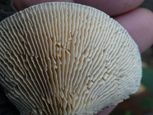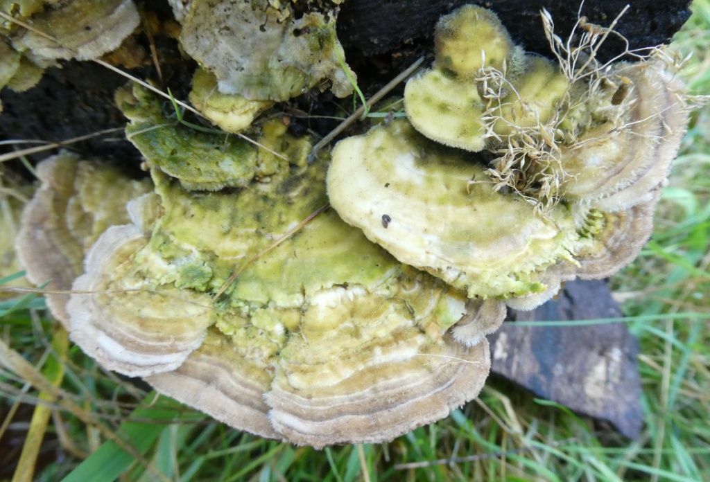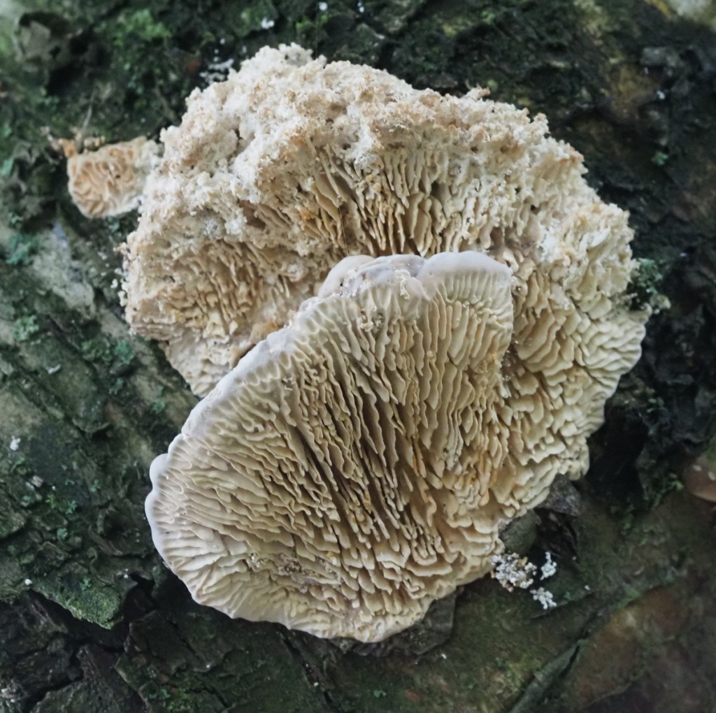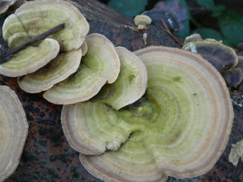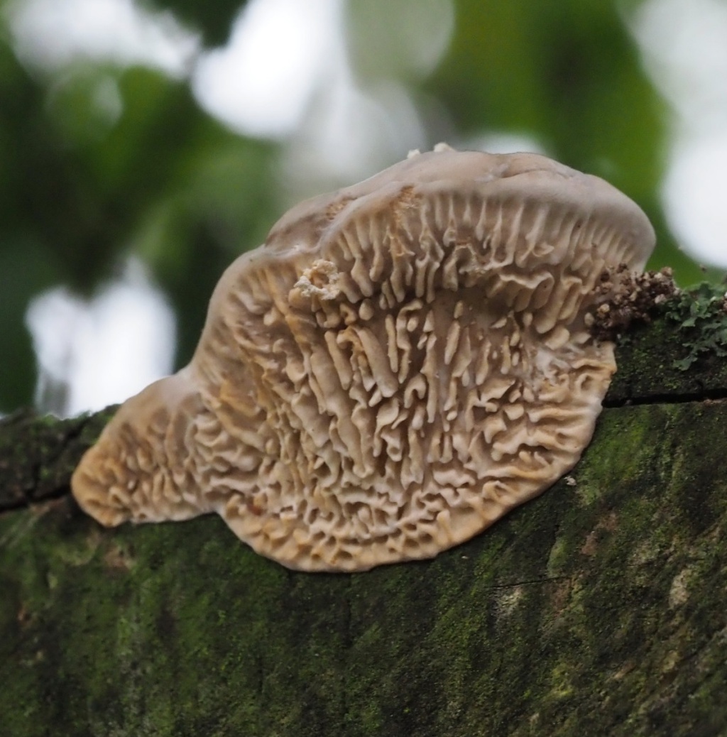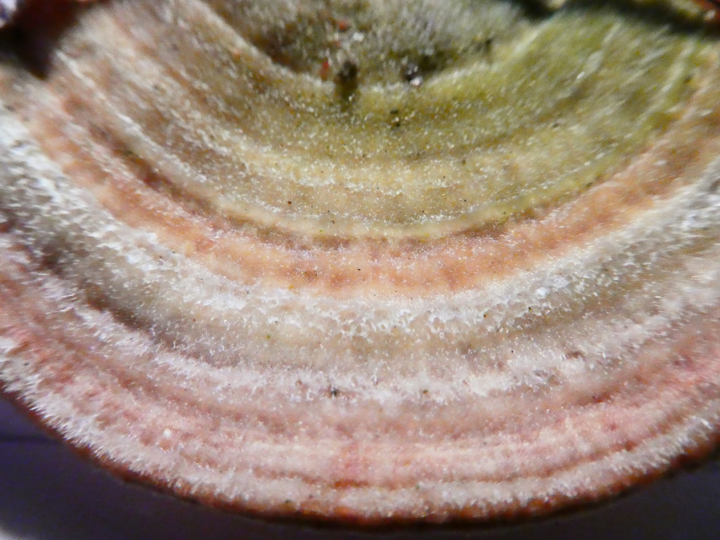 A thin, leathery annual bracket, with a pale, zonate upper surface with felted hairs. The fertile surface underneath is pale cream, darkening with age; pores initially rather maze-like but becoming gill-like later; 10 - 15 per cm. at the margins.