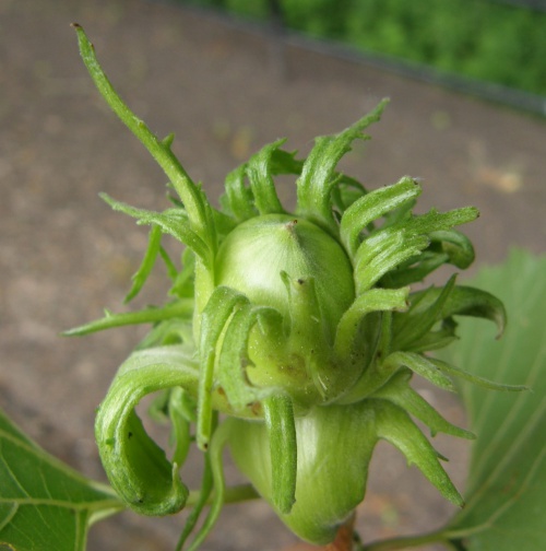 A medium to large sized tree which has slightly lobed, broadly-ovate leaves. Pendulous yellow catkins to 8cm in length. Nuts held within a deeply fringed husk.