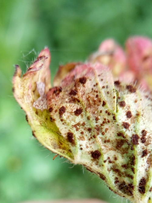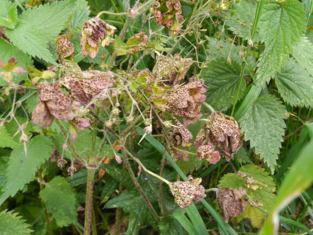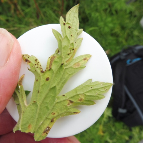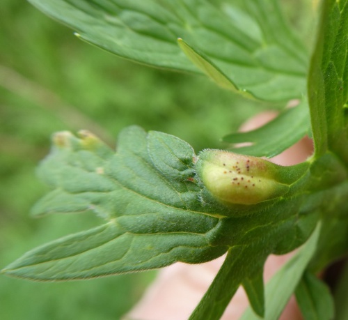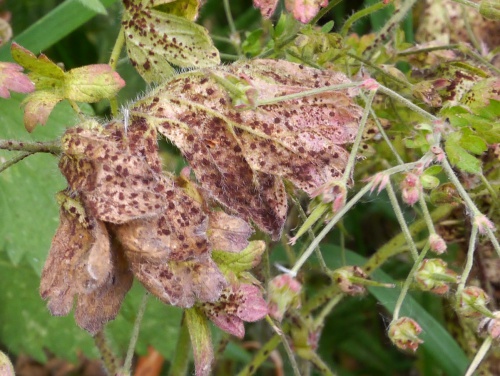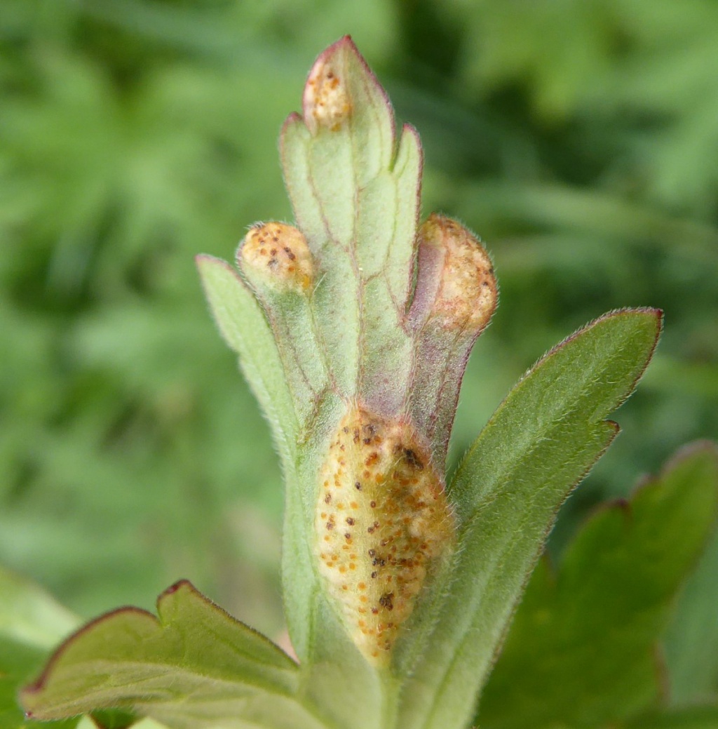 The aecial stage of Puccinia polygoni or polygoni-amphibiii galls some species of Cranesbill, including Geranium dissectum.  The galls have  cylindric aecia mostly on leaf undersides, with narrow recurved margin split into small segments on intensely reddened parts of the leaves. initially within pale green leaf spots.  (ref.  'Plant Parasites of Europe').