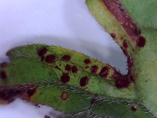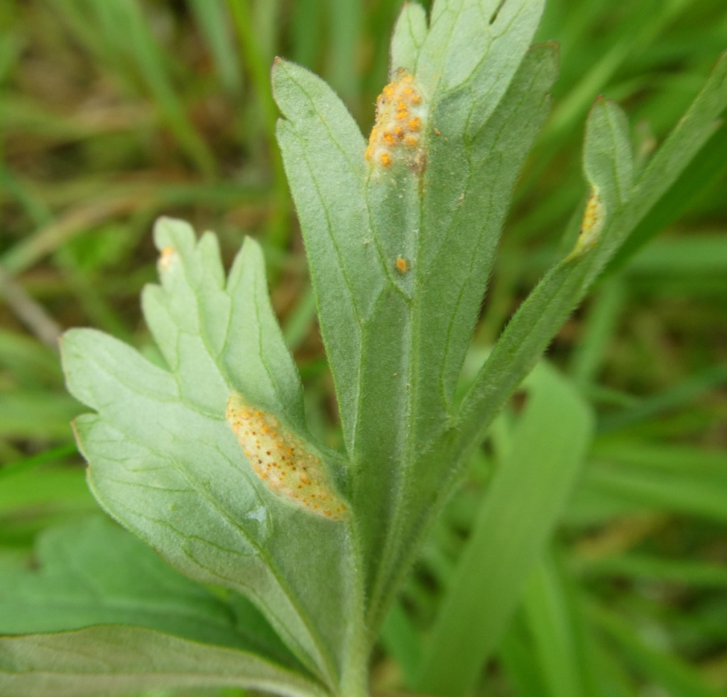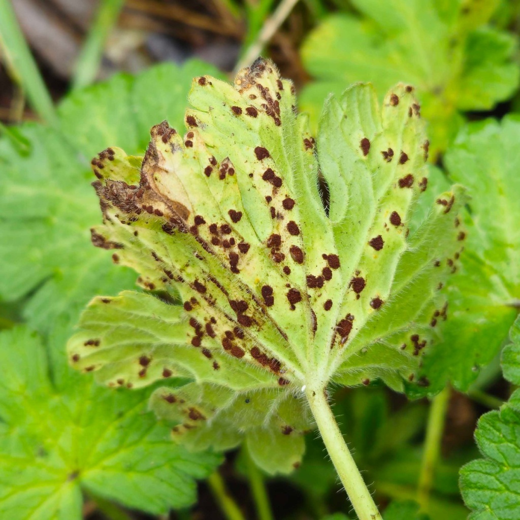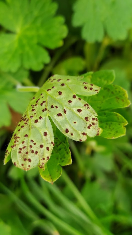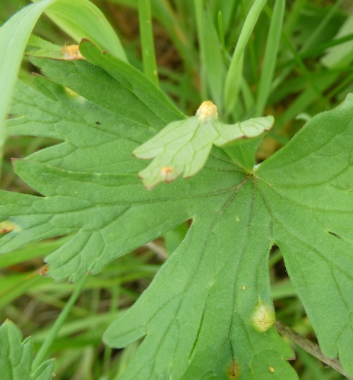 Uromyces geranii is a rust fungus that galls the leaves of various Geranium and Erodium species (Crane's-bills and Stork's-bills).  There is no host-plant alternation.  Aecia are orange, on leaf undersides and petiole; later pale brown uredinia and darker telia appear on the leaf underside.