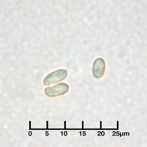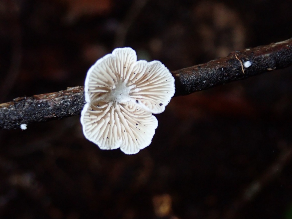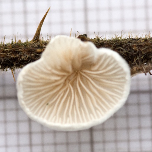 Cap 0.5 to 2cm across, kidney-shaped, white and felty-hairy, often lobed. Stem absent or rudimentary. Gills whitish at first becoming ochraceous flesh-coloured. Spore print pinkish-buff; spores ellipsoidal, 5-7 x 3-3.5µm.