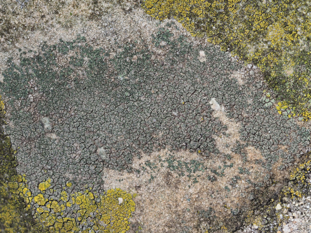 A grey, crustose lichen with few obvious features. Under magnification it is areolate (broken into many tiny islands).