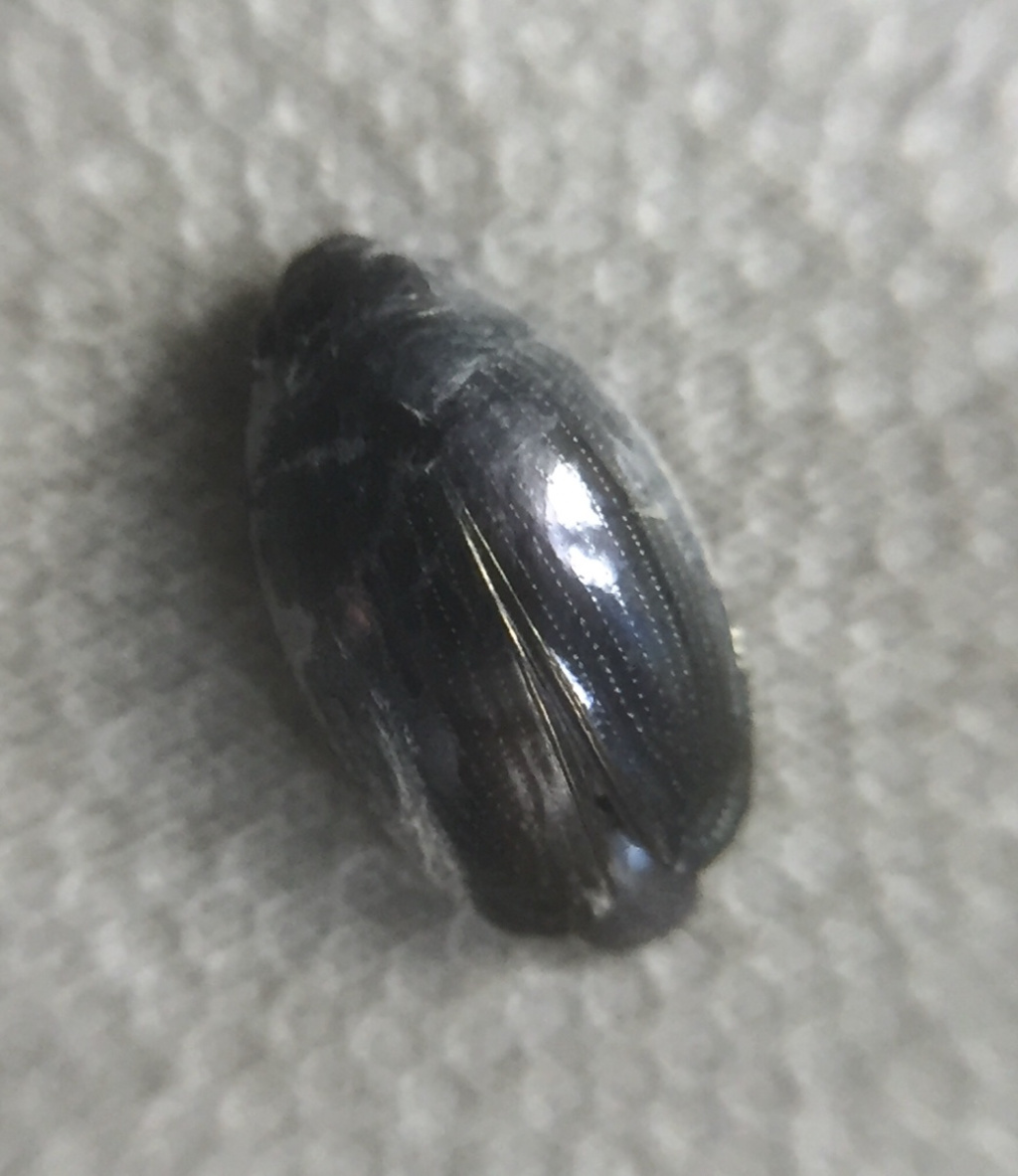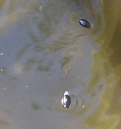Whirligig Beetles are small oval water-beetles, steely grey/black or bronze in colour with paler legs, and very short antennae. The middle and hind legs are paddle-shaped and adapted for swimming, wheras the front legs are for grasping prey and food. They carry an air-bubble on the tip of the abdomen, and their eyes are divided in two to see both above and below water. They are gregarious, and the name comes from their behaviour of swimming rapidly in circles on the water surface, often in small groups.