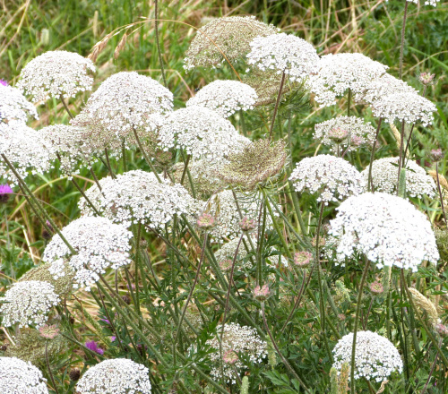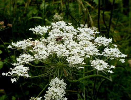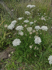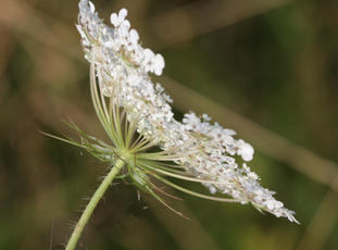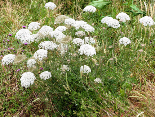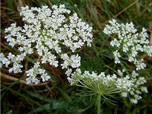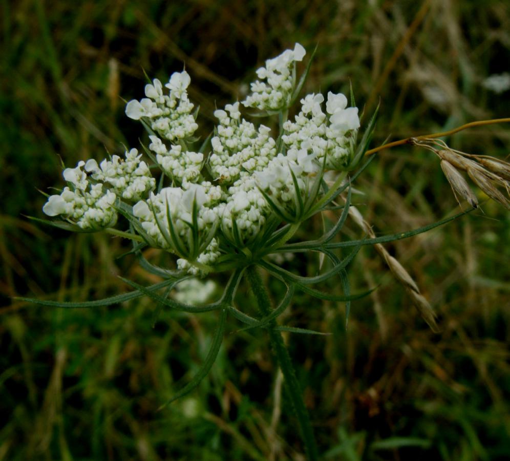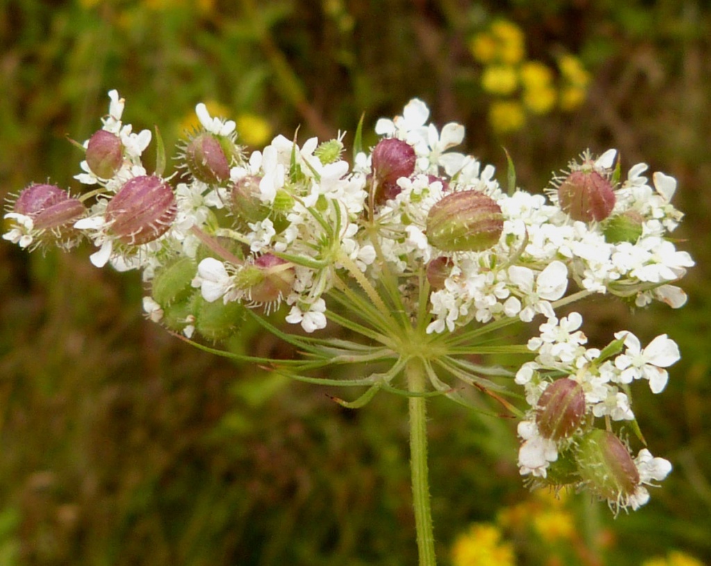 Short to tall plant, stem solid, often ridged. Leaves 2 or 3 pinnate feathery, with linear or lanceolate segments, the uppermost often bract like. Flowers white, the central one of the umbel sometimes purple, 2 mm, the umbels with numerous rays which become remarkably contracted in fruit. Bracts conspicuous, usually three lobed. Fruit with short spines. Tap root is white.