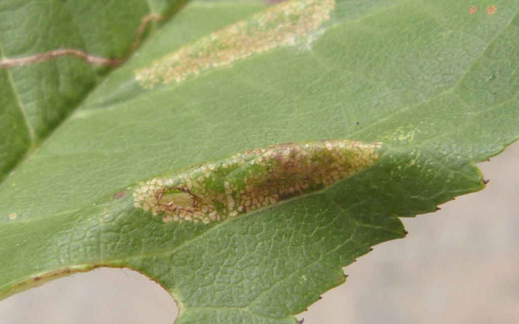 The larva of the moth Phyllonorycter cerasicolella mines the leaves of Wild Cherry and other Cherry species. The mine is underside, between veins, often causing leaf to arch.