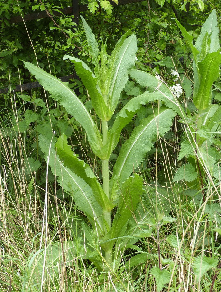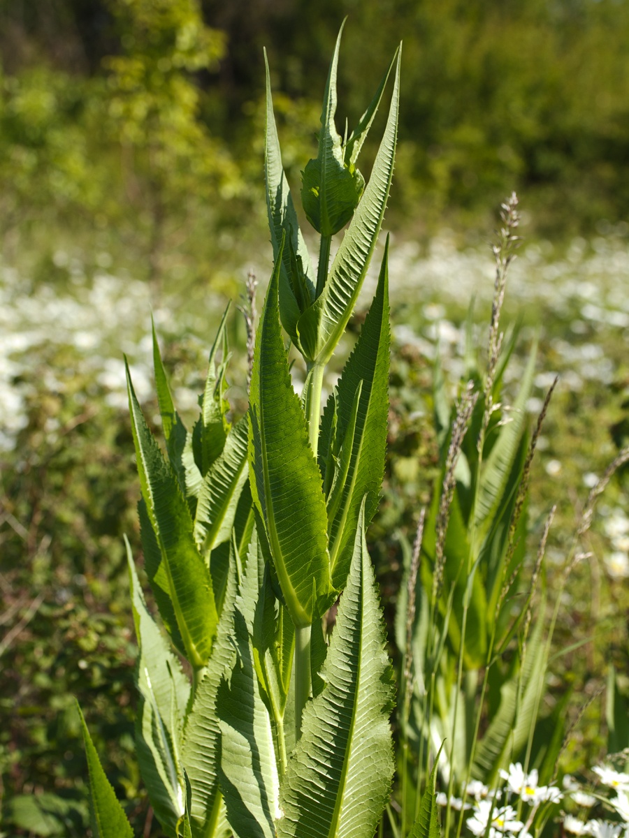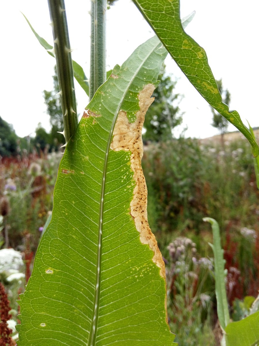 The larva of the Agromyzid fly Agromyza dipsaci mines the leaves of Teasel. It produces a long mine, which rapidly broadens, at the leaf edge. The mine turns brown.