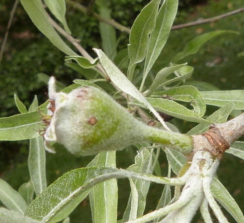 Leaves downy and similar to White Willow especially early in the season. It has small pear shaped fruits and white, five petalled flowers with many stamens.