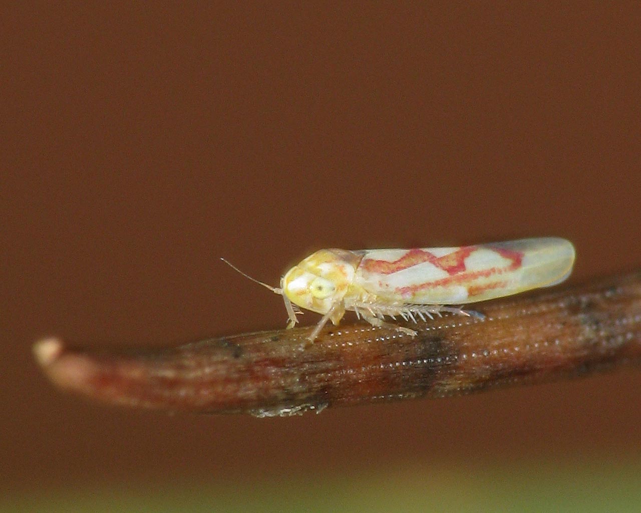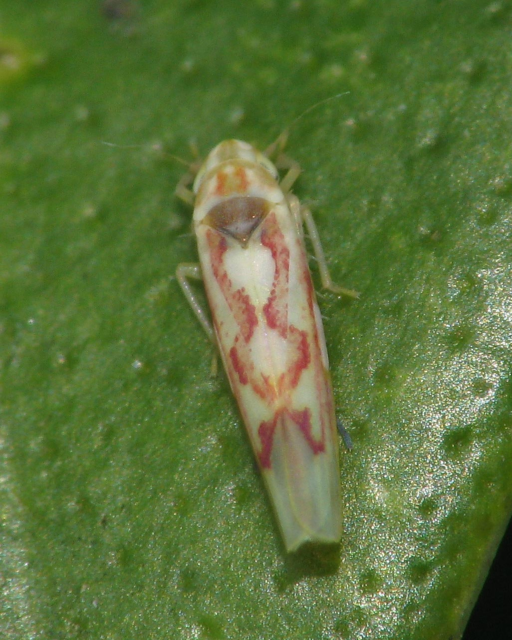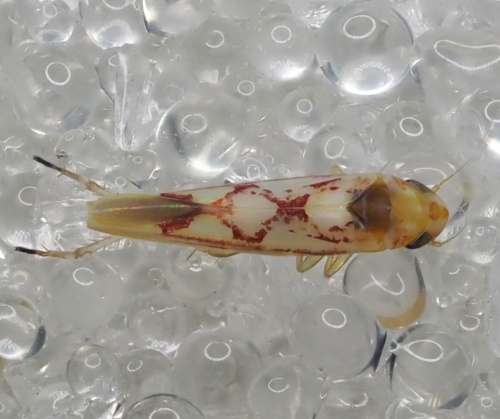 Length 3 mm. Forewings with a red zigzag pattern. The area of the clavus between the red zigzags is pale. and the scutellum is brown. In males, the basal segment and adjacent segment of the rear tarsi are pale and the apical segment and part of the middle segment are darkened.