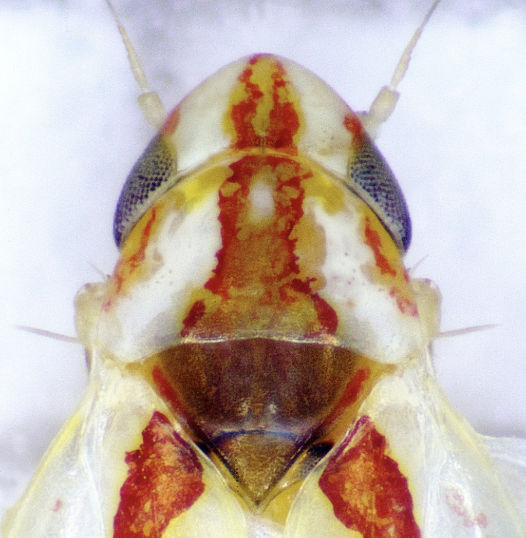 Zygina angusta/ordinaria have a smoky tint over the clavus betwen the red zigzags and a dark scutellum. Zygina tiliae/suavis/schneideri have a pale yellowish scutellum or with red markings; male tarsi are all darkened.