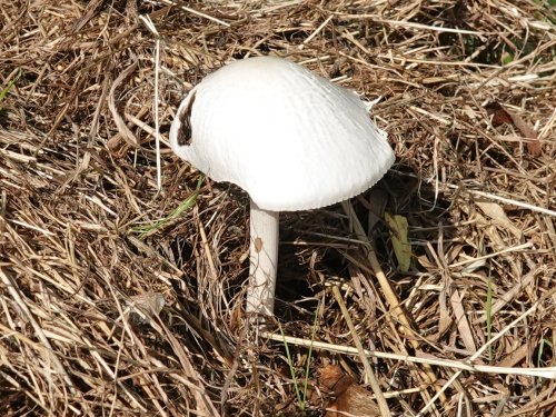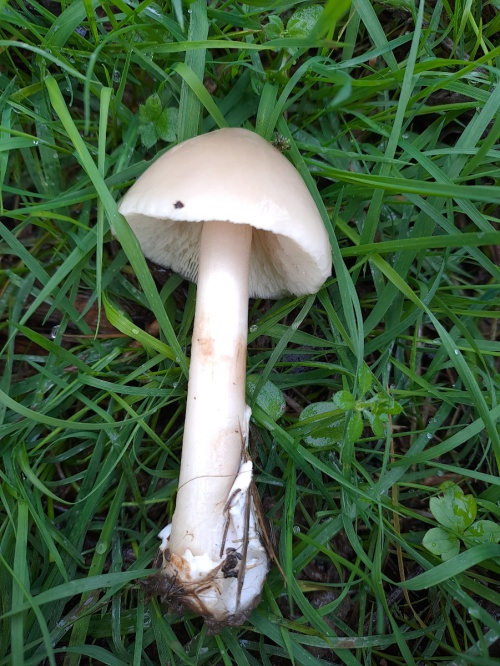 Cap is conical to convex in shape, white to off white, sometimes with a brownish tinge and averaging around 10 or 12 cm. The gills are free i.e. not attached to the top of the stem, and they turn pink as the spores ripen. The stem has no ring but has a persistent sac-like volva at the base.