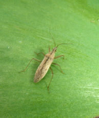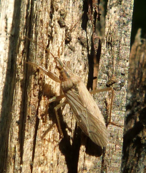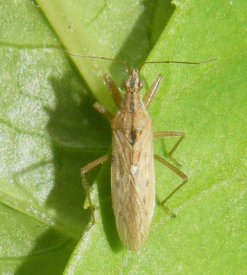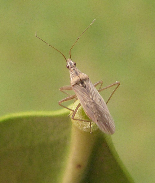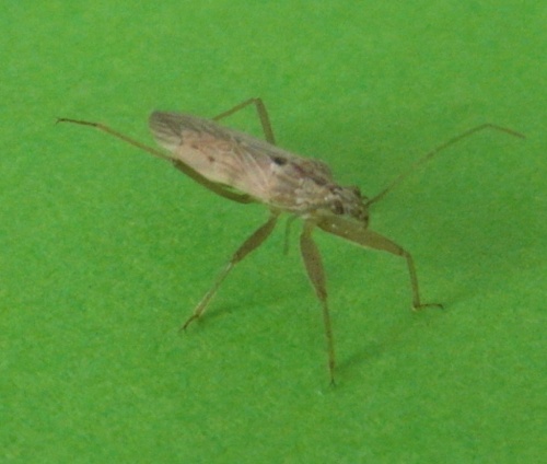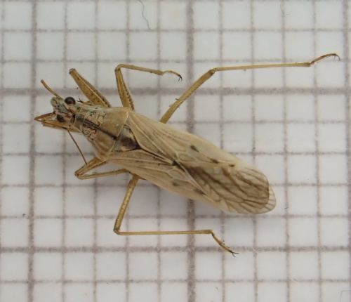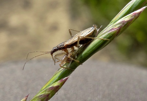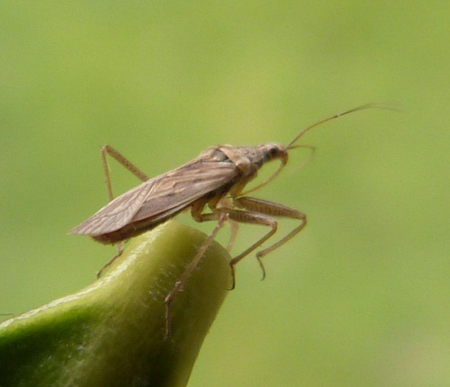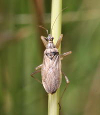 Length 8-8.5 mm. A grey/brown nabid which is widespread in dry grassy habitats. This species is always macropterous, the wings extending beyond the end of the abdomen. Densely hairy forewings and the pronotum is considerably wider than it is long.