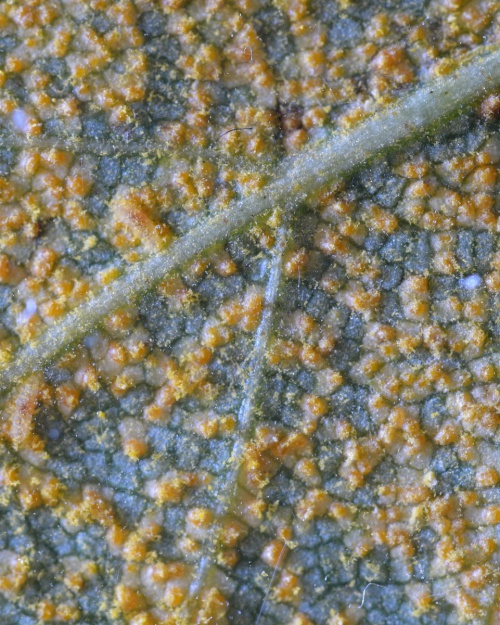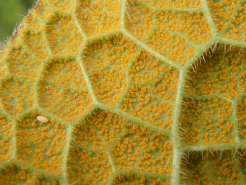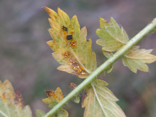 - Teliospores borne on telia - in late summer, dark brown or black pustules are produced on the primary host bearing the over-wintering teliospores (see example).