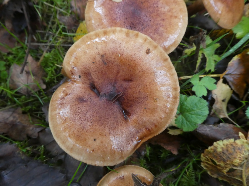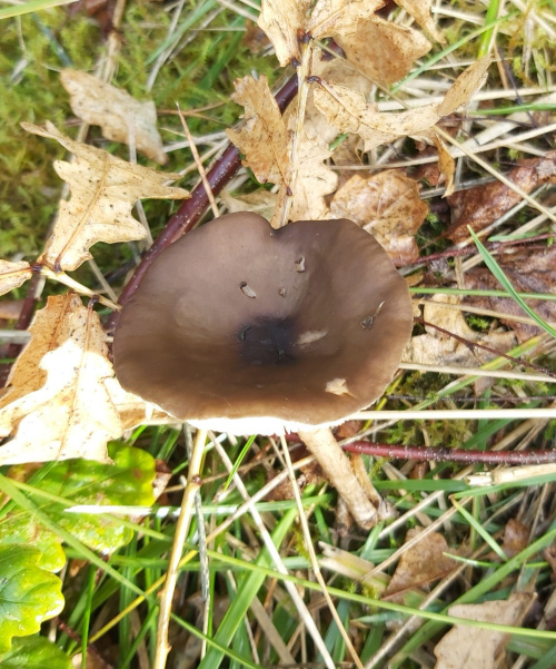 Funnels (Clitocybe and Infundibulicybe) have white or cream or pinkish-clay spore-prints. It can assist identification to take a print from a specimen; spore size may also be important. Not all are funnel shaped but when mature usually have a depressed centre and gills that are decurrent, sometimes strongly so. Smell should also be noted; e.g. some smell farinaceous (i.e. floury); others have sweet, spicy or aniseed smells. In the gallery below, and exclamation mark after the camera icon indicates that a spore-print will be helpful or that a distinctive smell should be noted.