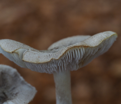 Knights (Tricholoma) are another large and difficult genus. They have white smooth spores and usually have emarginate gills; some have a fine veil, the remains of which can persist as a ring on the stipe. It is always helpful to sniff the fresh specimens; some have distinctive (or no) smells.