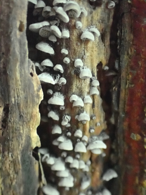 Fungi are not plants, as was thought to be so in the past, but in a separate Kingdom of their own. In most cases, the main body of the fungus is hidden from view. It is a network of threads (hyphae) collectively called a 'mycelium', which permeate the substrate on which the fungus grows. The hyphae absorb nutrients and water from the substrate. The reproductive spore-producing structures, such as the familiar mushroom or bracket, are the visible parts of the fungus.