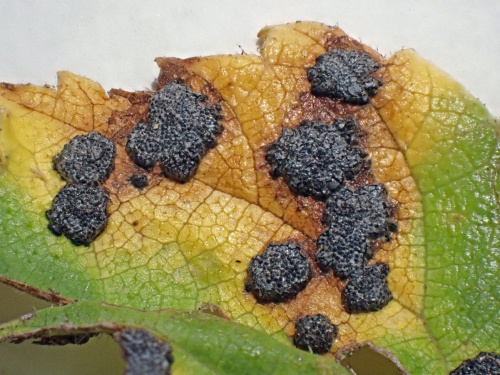 This family includes the White Moulds (Ramularia spp.) - a large group of parasitic fungi, some of which cause significant diseases of crops and garden plants. Affected leaves have spots on the upper surface. These are 'anamorph' species and reproduction is asexual via 'conidia'. The fungal hyphae are embedded in the host tissue. The conidia are borne on 'conidiophores' grouped into dense white or greyish tufts called 'caespituli', which usuallay emerge on the underside of the leaf from stomata - yu should check for these using hand lens or low power microscope. This is very different to the web of mycelia caused by Erysiphaceae - the powdery mildews. Most are host specific, so the starting point for identification is to accurately identify the host species; this must be noted in your record. A few hosts have several White Moulds, and in these cases microscopic examination of conidia is needed.