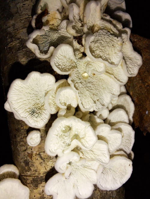 Brackets project from the trunk or branch or log, and often have a woody or leathery feel. Some are perennial, growing to a large size over many years - these shouldn't be collected. Spores form in tubes on the underside of the brackets, which end in pores that can be rounded, mazelike, elongated, angular, etc. The shape of the pores can help to identify them, so always photograph the underside. Crusts, Porecrusts and Resupinates form a layer over the wood substrate. Some species have growth forms with a resupinate part and bracketing part to the fungus.