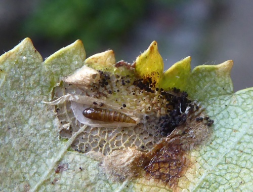 Leaf-mining is a specialised form of larval feeding on plants. For at least part of their life, the larva of some species of moths, flies, sawflies and beetles live and feed within a leaf, usually between the upper and lower epidermis; some may also pupate within the leaf. For many of these species, the pattern of feeding and deposition of frass may be unique to that species and, in combination with the host plant and characteristics, this lets us identify the species.