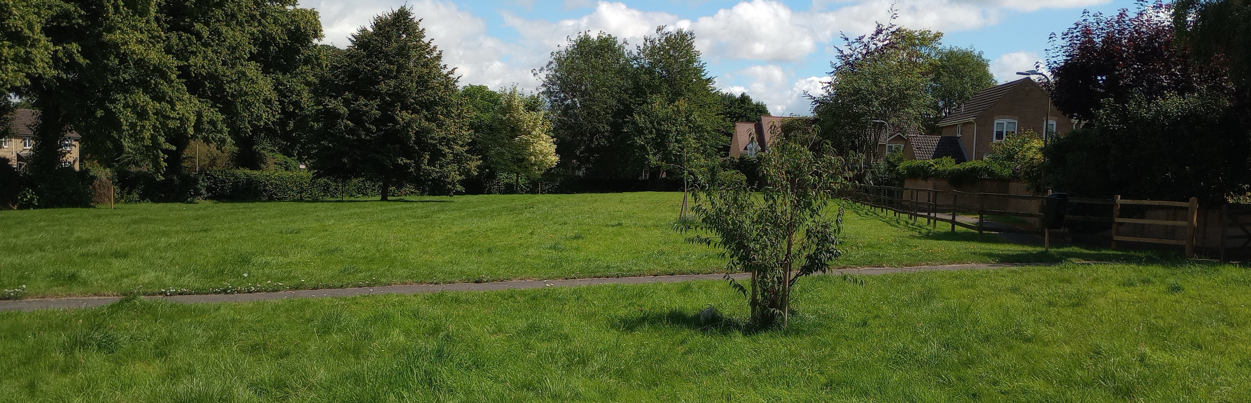 This area of public open space, a rectangle of roughly 0.6 hectares, is located next to Main Street. It has been regularly mown for many years but the intention is to now establish a meadow strip of approximately 3-4m width around the periphery to improve biodiversity by managing it as a wildflower meadow so it can support a much greater variety of wildlife. A row of mature trees, mainly Common Lime, are growing along the Main Street boundary and a couple of smaller trees (Norway Maple and Whitebeam) have been planted in the grassy areas. The site has been locally referred to as ‘the cow field’, which may refer back to its agricultural use before it was established as public open space.